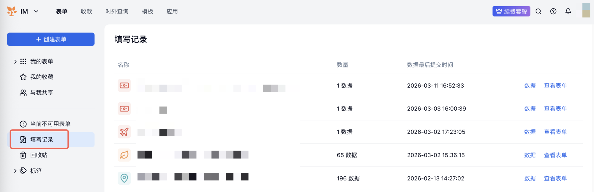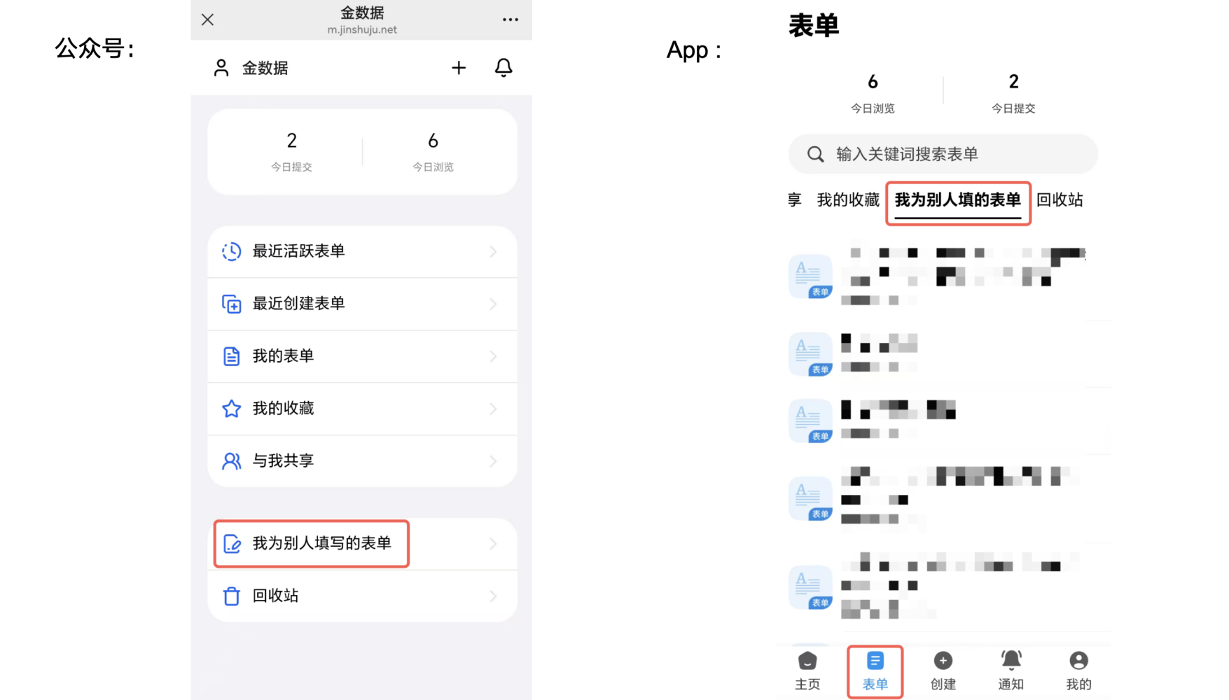可前往 金数据官网 、公众号、App 登录账号后,在「我为别人填写的表单」中查看自己的填写记录。