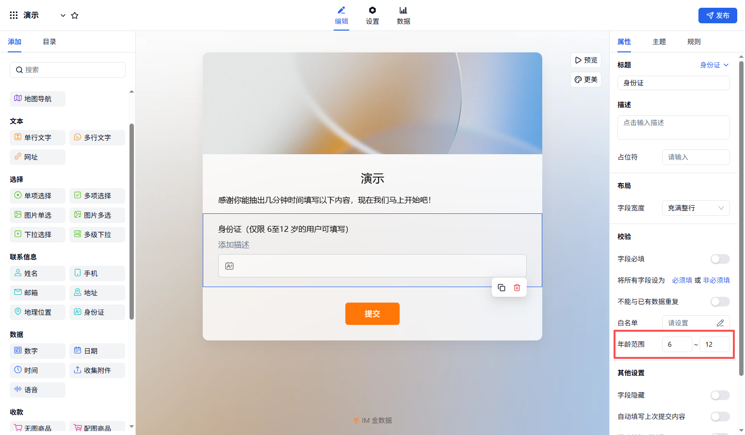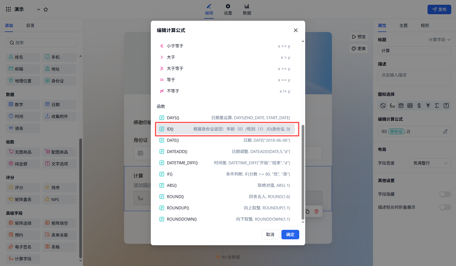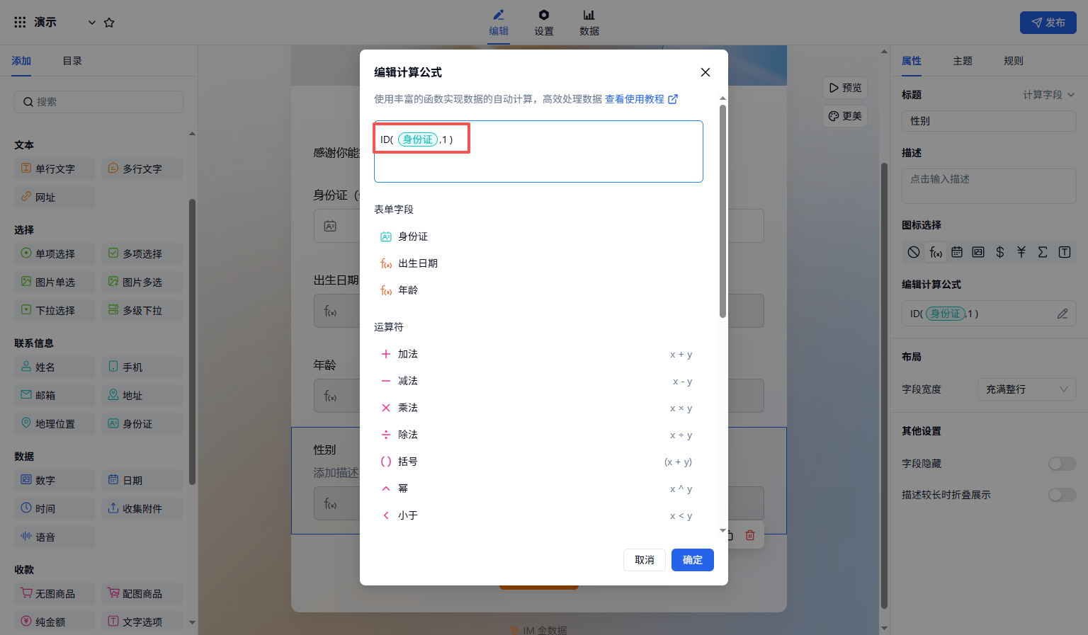 3)在 ID 后插入「身份证」字段,英文逗号后输入数字 0 则显示「年龄」,英文逗号后输入数字 1 则显示「性别」,英文逗号后输入数字 2 则显示「出生日期」。