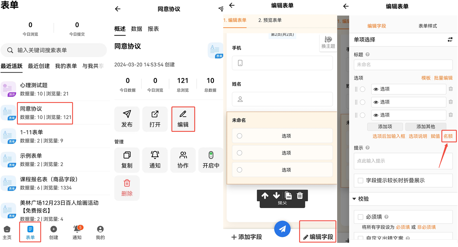 选项名额设置路径:选择字段-右侧「属性」-点击「名额」,即可弹出「选项名额」的设置弹窗