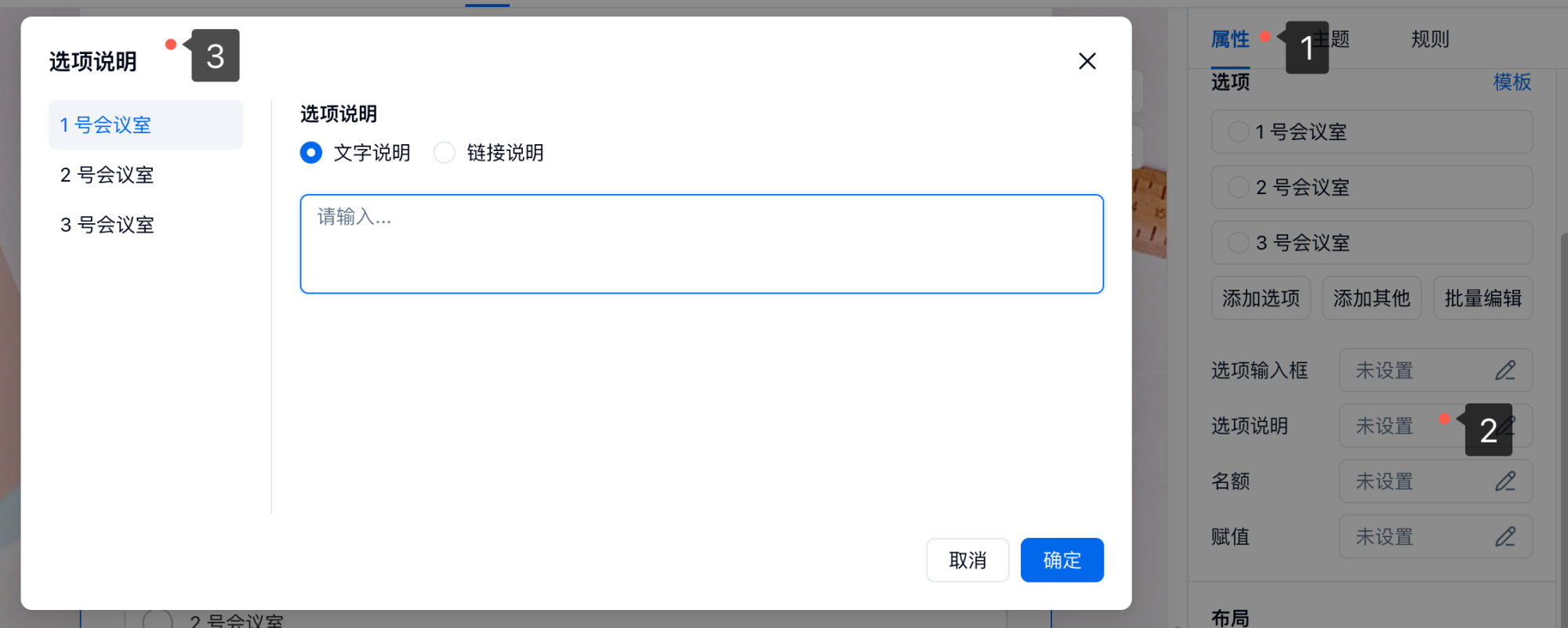 选项名额设置路径:选择字段-右侧「属性」-点击「选项说明」,即可弹出「选项说明」的设置弹窗