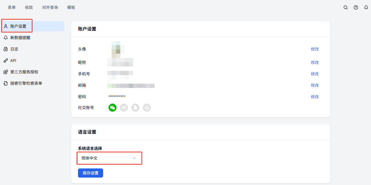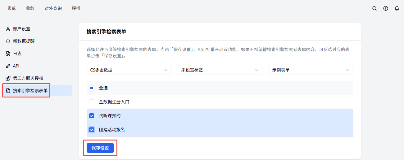 如果你不希望被搜索引擎检索到表单内容,可以不勾选对应的表单,点击「保存设置」。