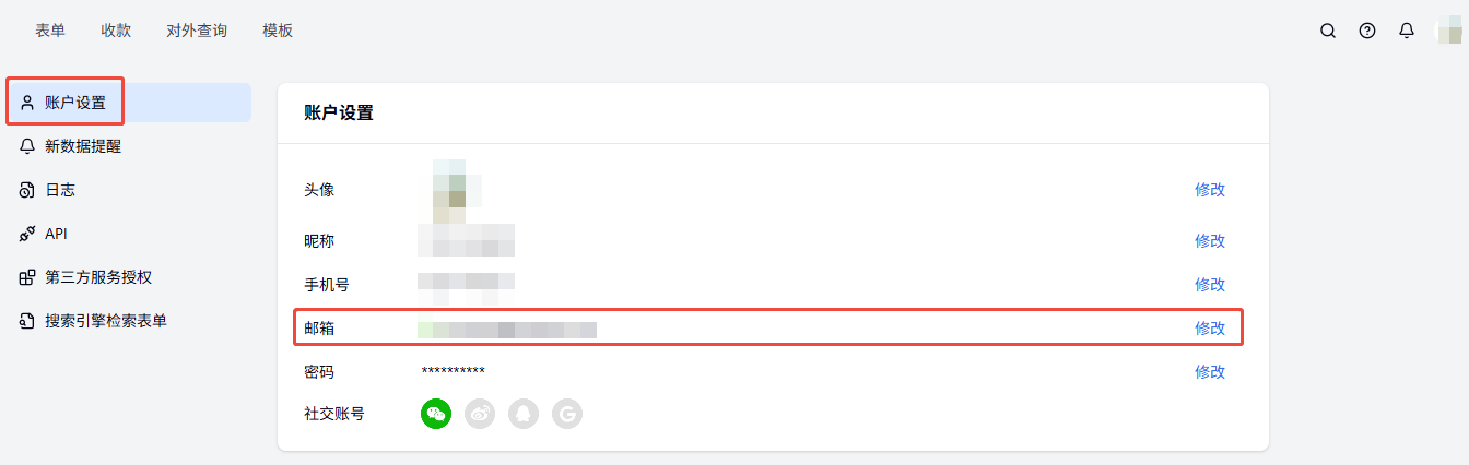 电脑网页端 登录账号 ,点击「右上角头像」→「个人中心」→「账户设置」。点击「修改」,输入新的邮箱号和金数据登录密码(如还没有登录密码,请先设置),即可绑定成功。