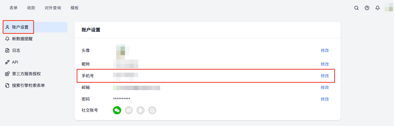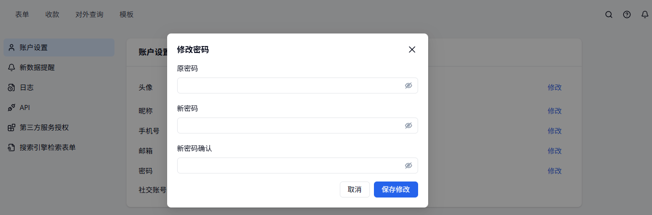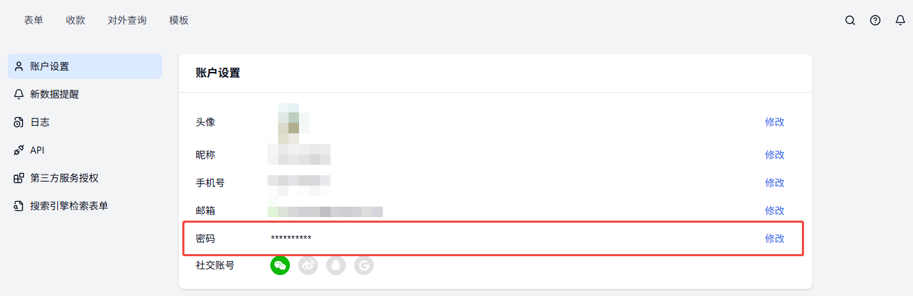 如果你想要自己的问卷被百度等搜索引擎收录,让你的客户或用户可以在百度搜索到你的表单,你可以点击右上角的头像按钮,进入「个人中心」→「搜索引擎检索表单」。