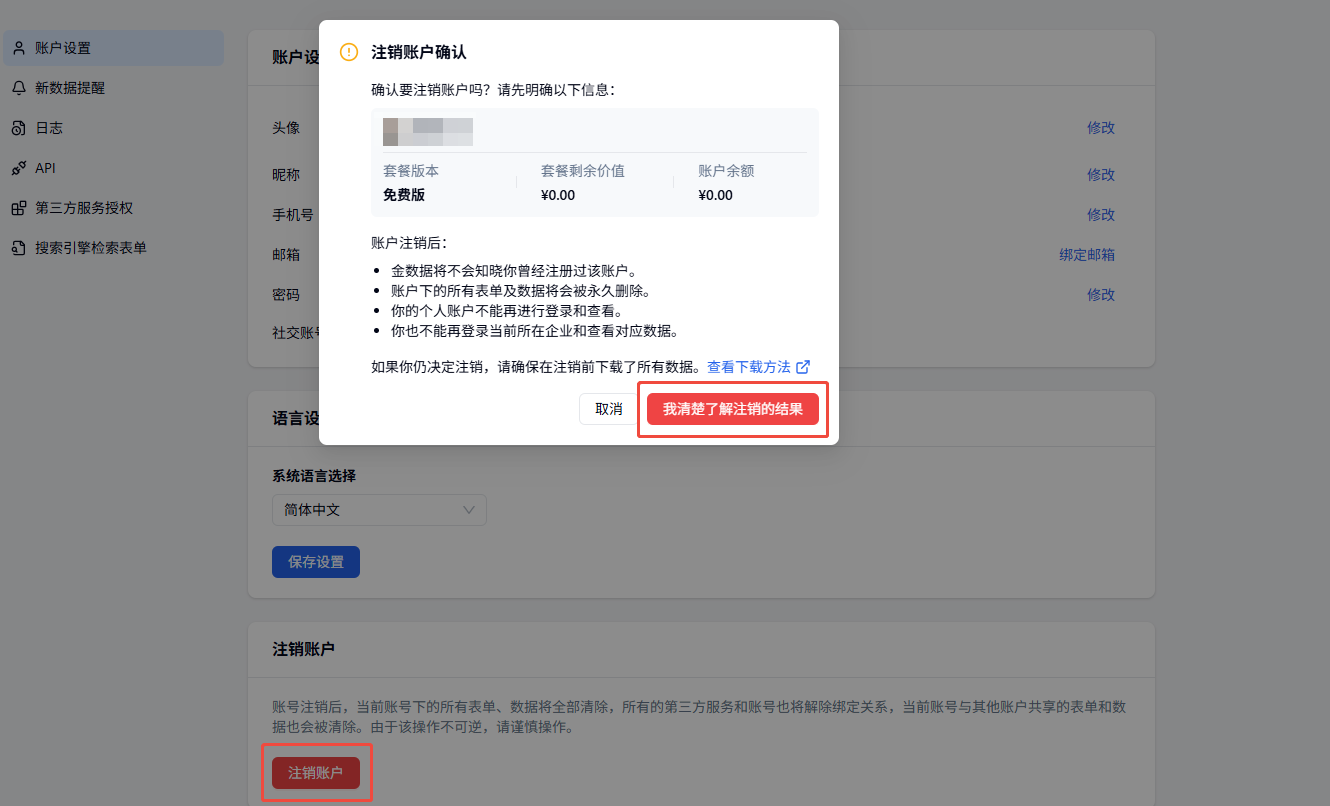 金数据支持你注销不需要使用的账号。账号注销后,当前账号下的所有表单、数据将全部清除,所有的第三方服务和账号也将解除绑定关系,当前账号与其他账户共享的表单和数据也会被清除(其他账户中也不再可见)。