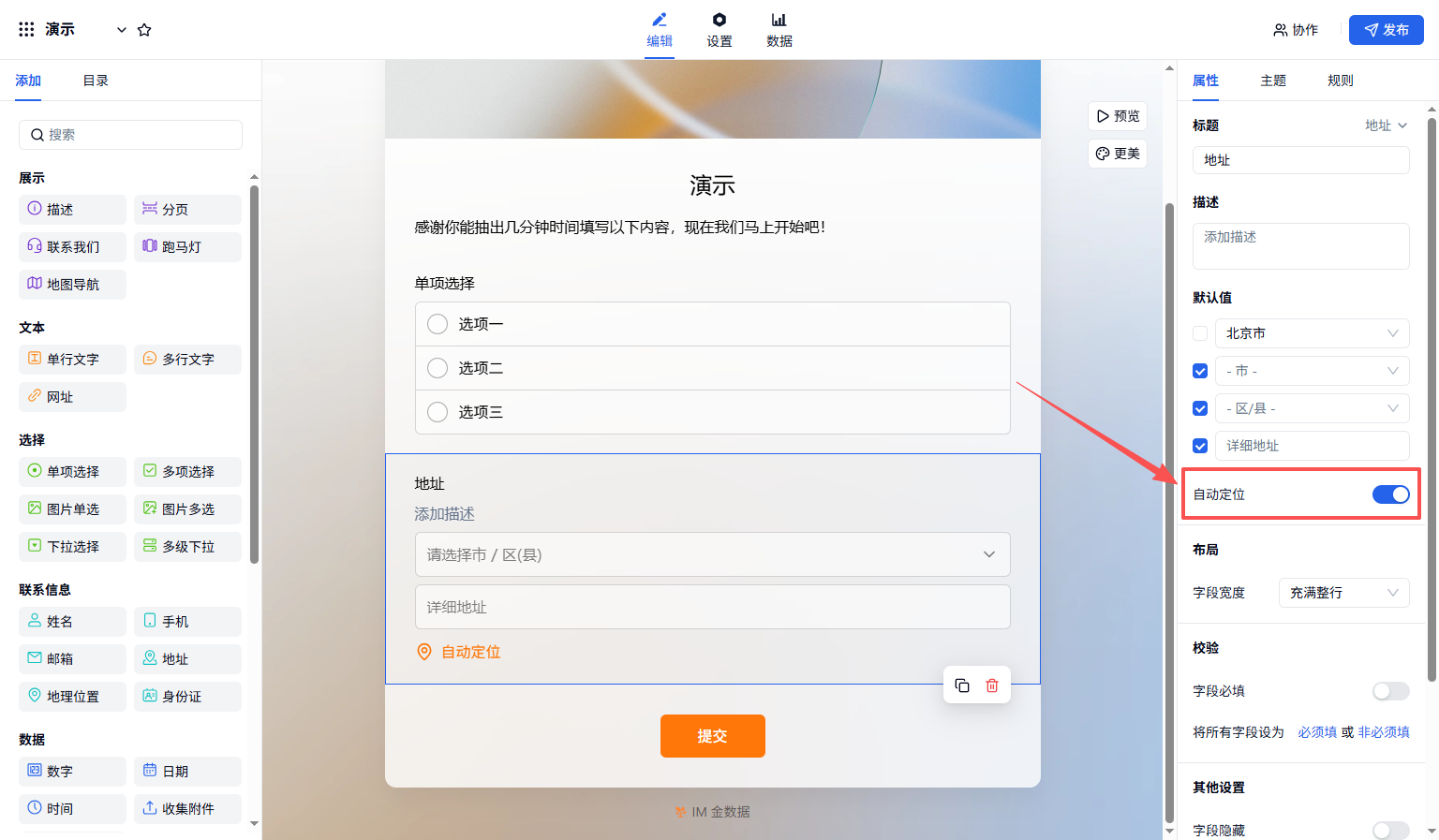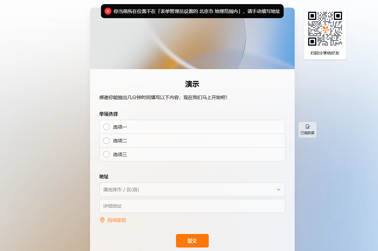 「地址」字段预置省、市、区(县)三级,简化填写;支持「自动定位」获取当前位置,或手动输入。