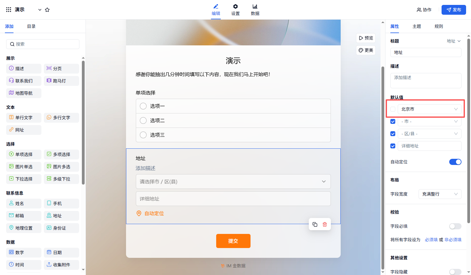 可限制填写特定省/市/区/县,默认值不匹配时报错。