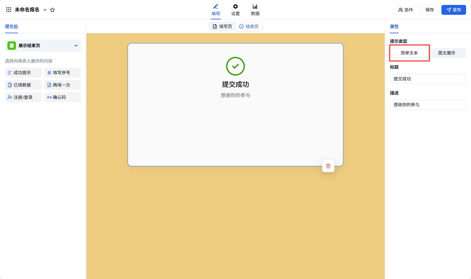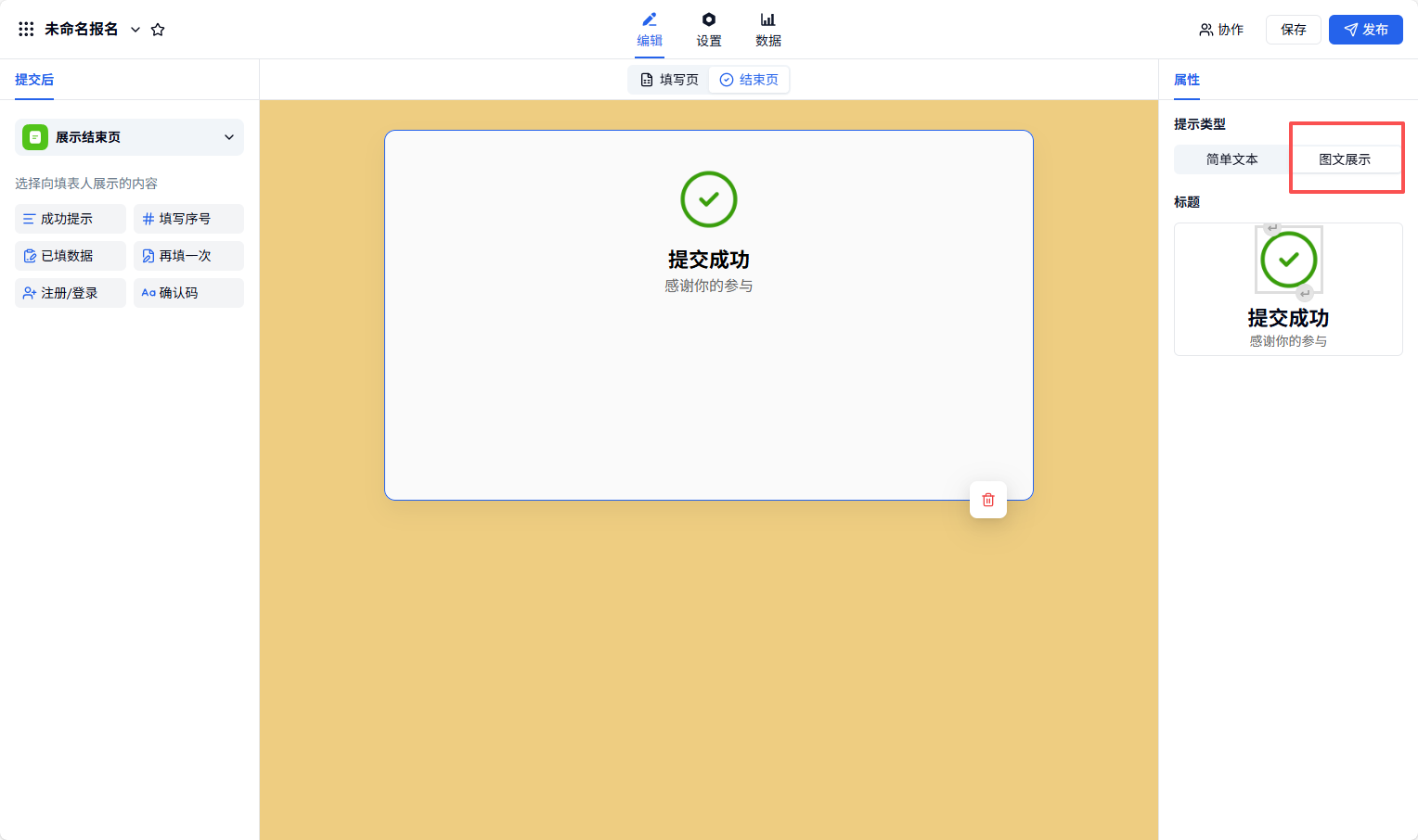 电脑端 登录账号 后,点击进入表单,在「编辑——结束页」,可以选择向填表人展示的内容。