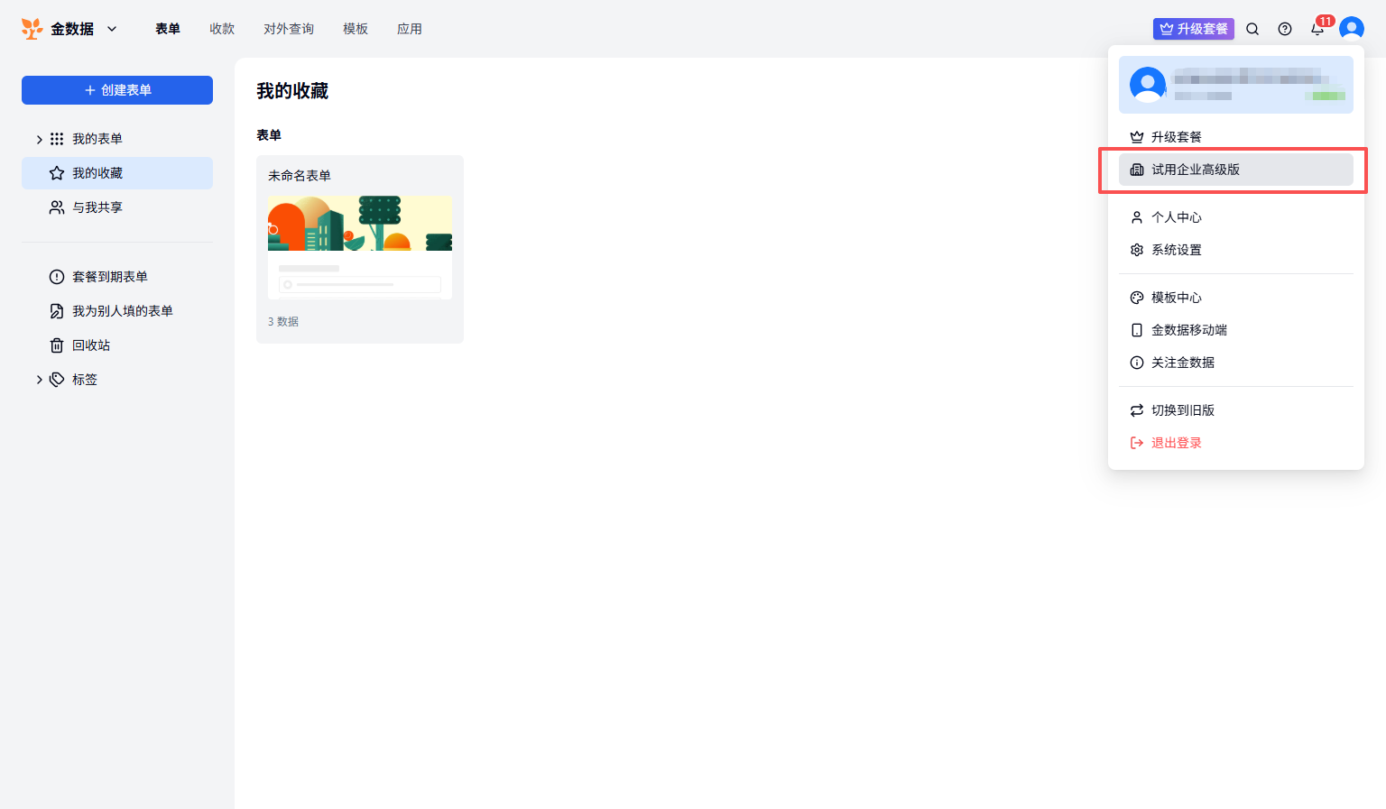 在 主页 点击右上角头像,点击「试用企业套餐」,或在「系统设置- 套餐概览」右上角可以点击「试用企业功能」,首次试用你将获得 7 天的试用期,体验 23,999 元/年的企业高级版所有功能。