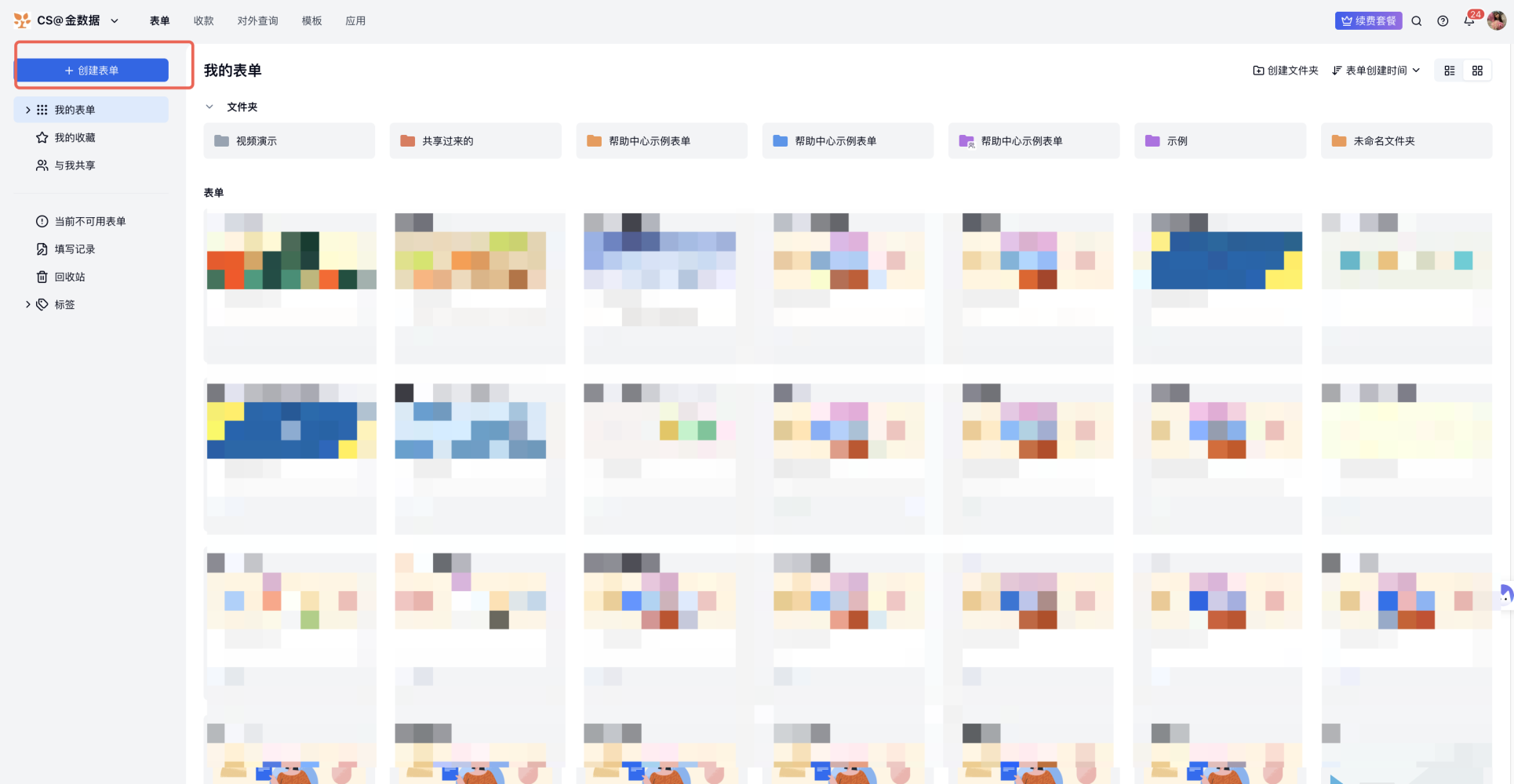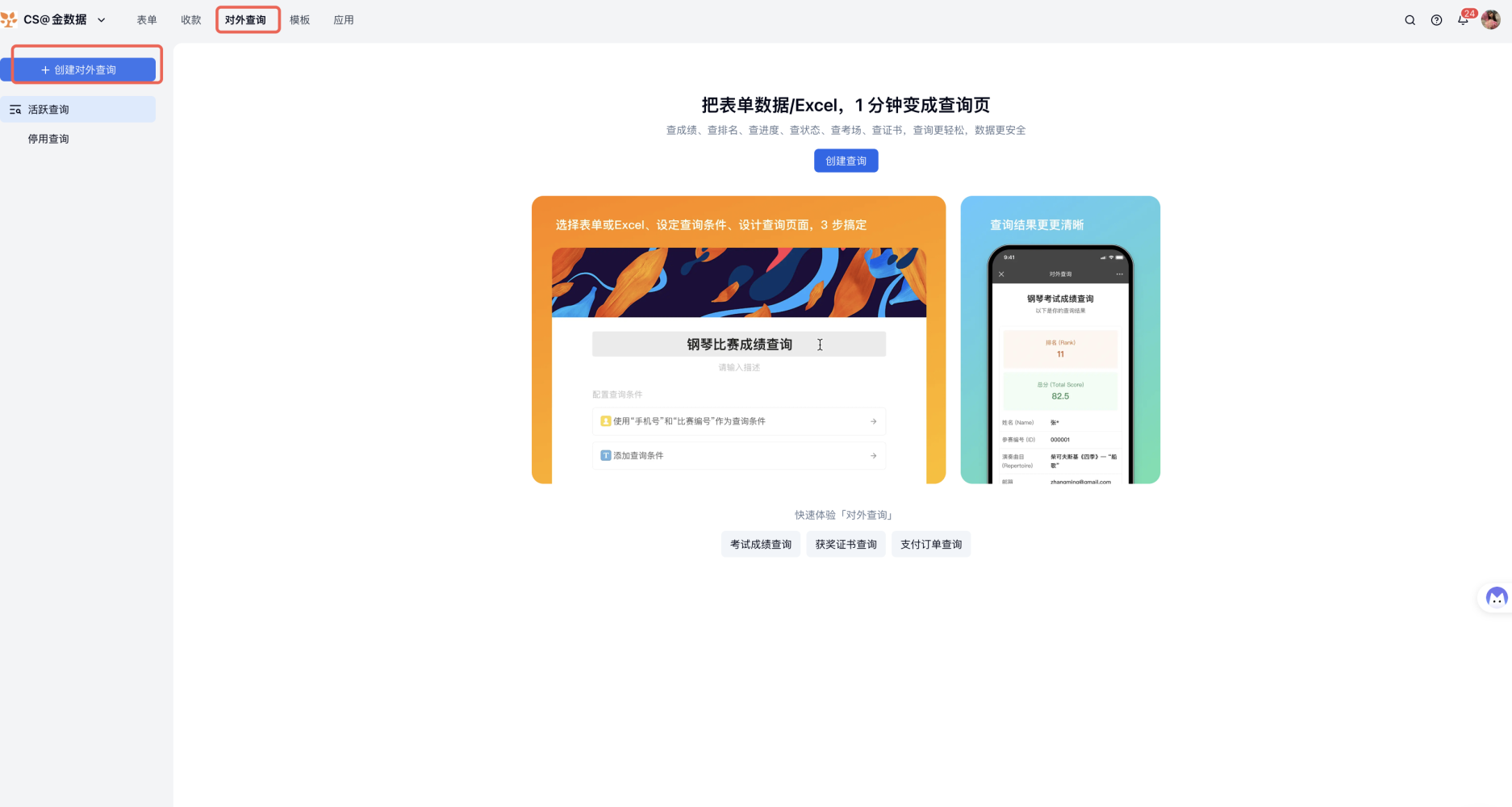1) 金数据首页左上角依次点击「对外查询——创建对外查询——选择对应表单」。