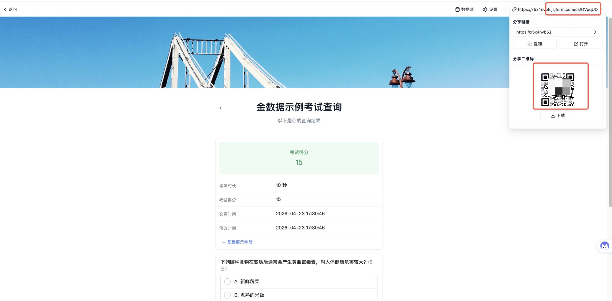 我们可以创建考试表单的「成绩查询」链接,让学员自主查询成绩。设置步骤如下: