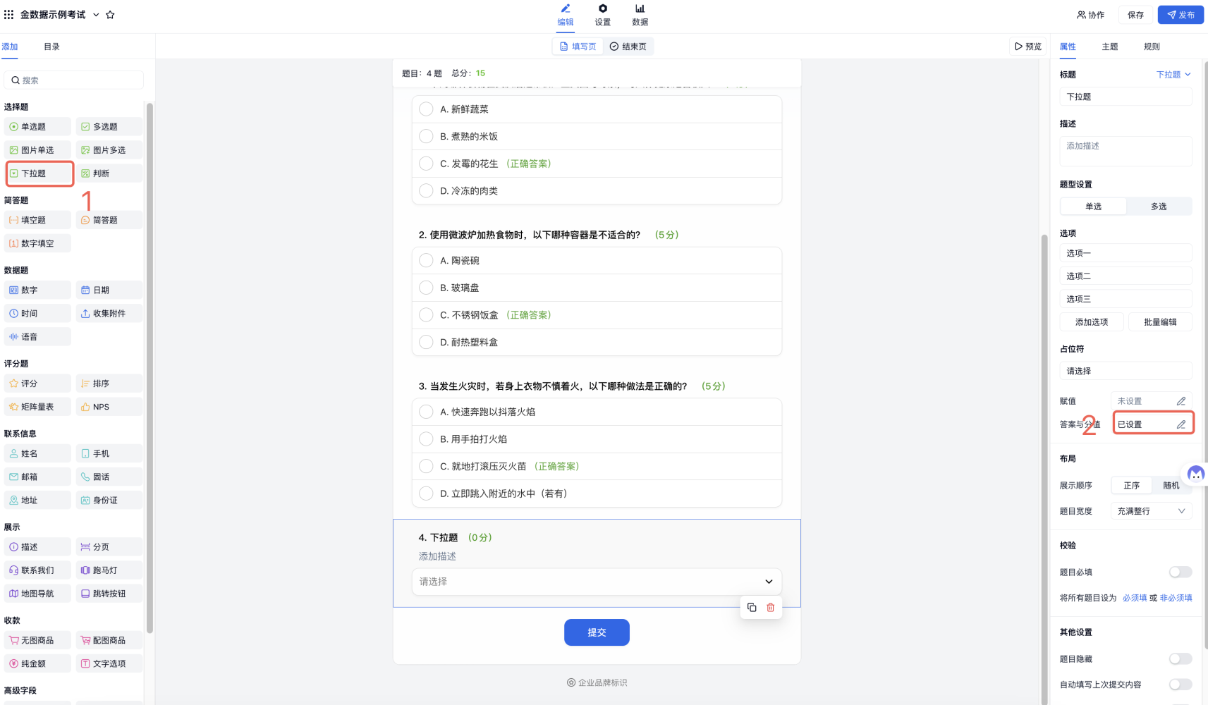 考生考试结束后,表单创建者在表单中添加「下拉题」,编辑选项文字为 1 分、2分、3分......等。再给「下拉题」设置对应分值。这道题作用是老师在后台阅卷后补充分数。