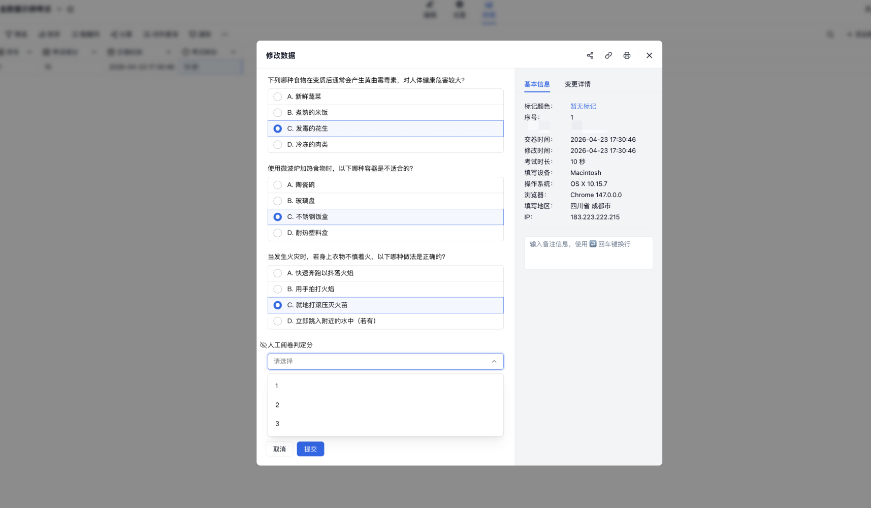 老师到表单数据页面,点击每一条数据去修改,查看考生在主观题答题内容,然后手动在「下拉题」选择判定的分数,保存修改。此操作完成后,数据的总分数自动更新。