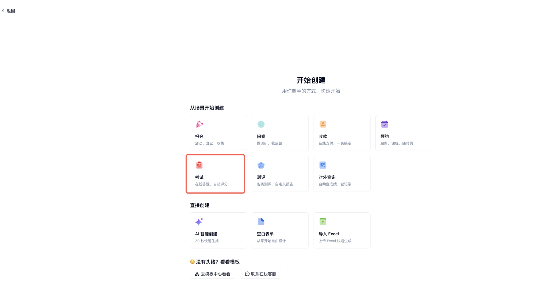 1) 在账号主页点击左上角「创建」,选择「考试」场景,你可以选择单页或者分页样式。