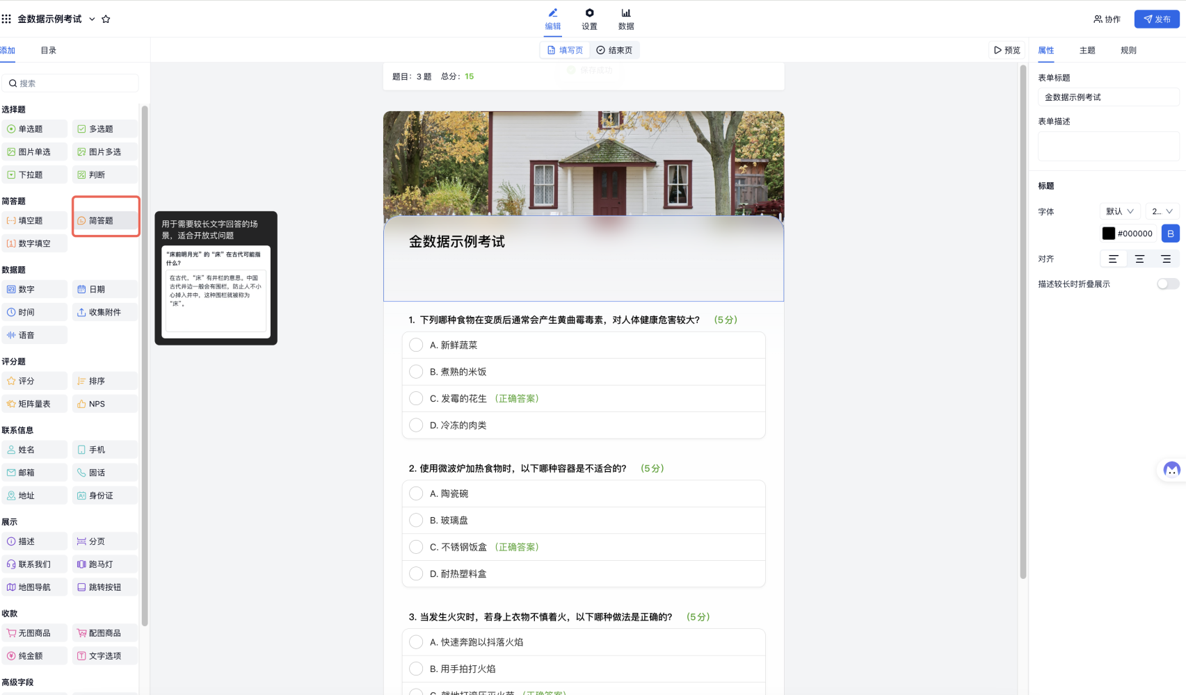 2) 进入考试编辑页面,根据实际需求去添加考生身份信息题,以及支持设置分值和答案的选择题、判断题、简答题等类型。如果需要添加主观题,实现考试后人工阅卷,请添加「简答题」。将表单链接、二维码发给考生参加考试。