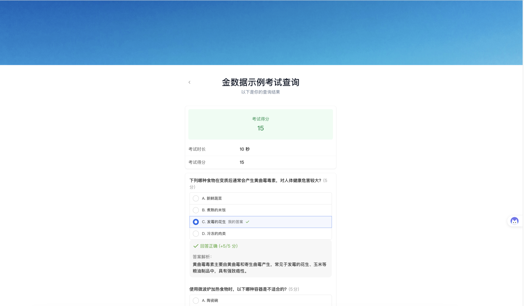 示例场景:学校开展急救知识与技能培训考试,学生线上考试,主观题在考试后交由老师人工判分,学生可自主查询总得分。