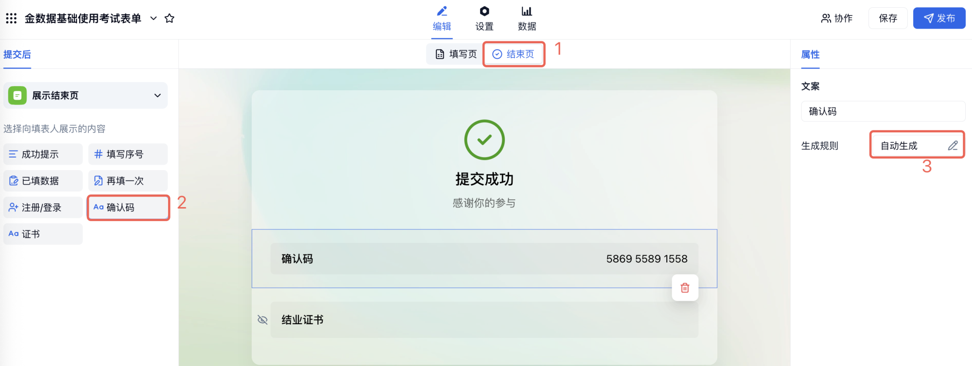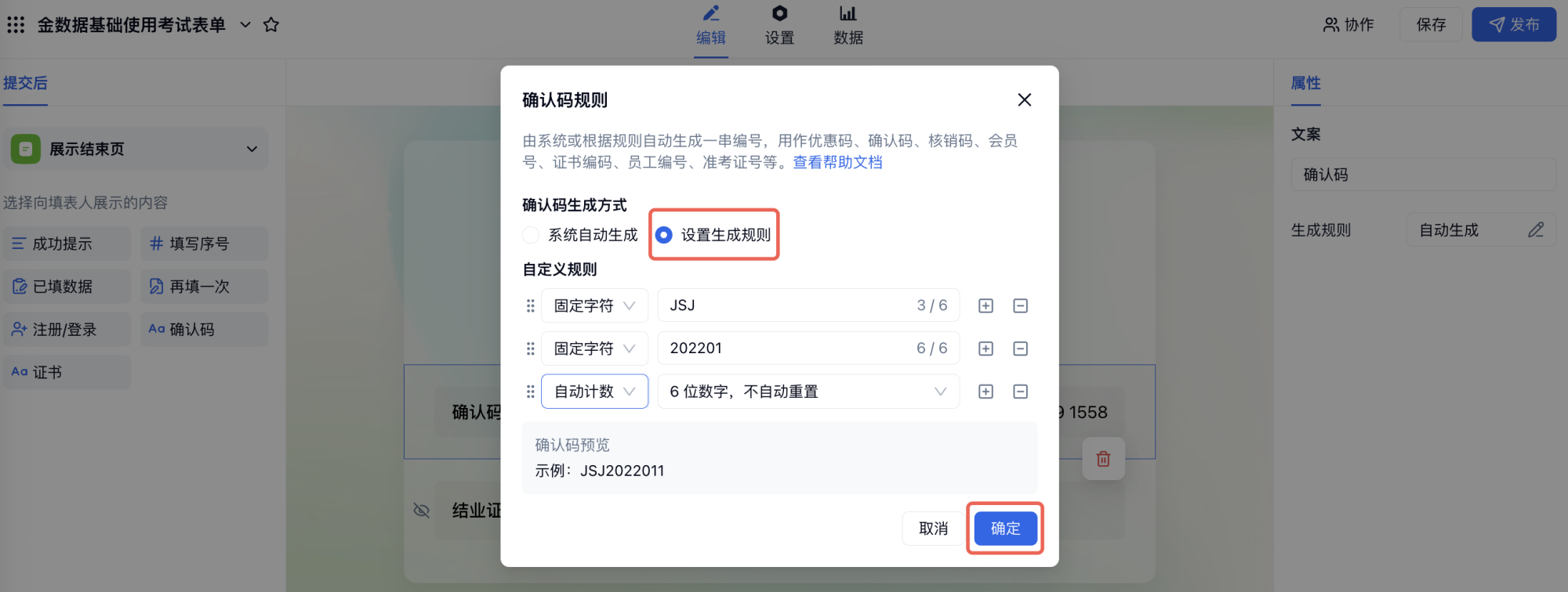 在表单「编辑」→「结束页」→「确认码」页面,使用确认码的「设置生成规则」功能,可以生成证书编码。比如本次我们设置证书编码格式为「金数据缩写 JSJ + 培训期数 202201 + 6 位的自动排序」。