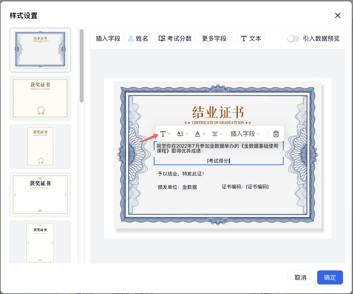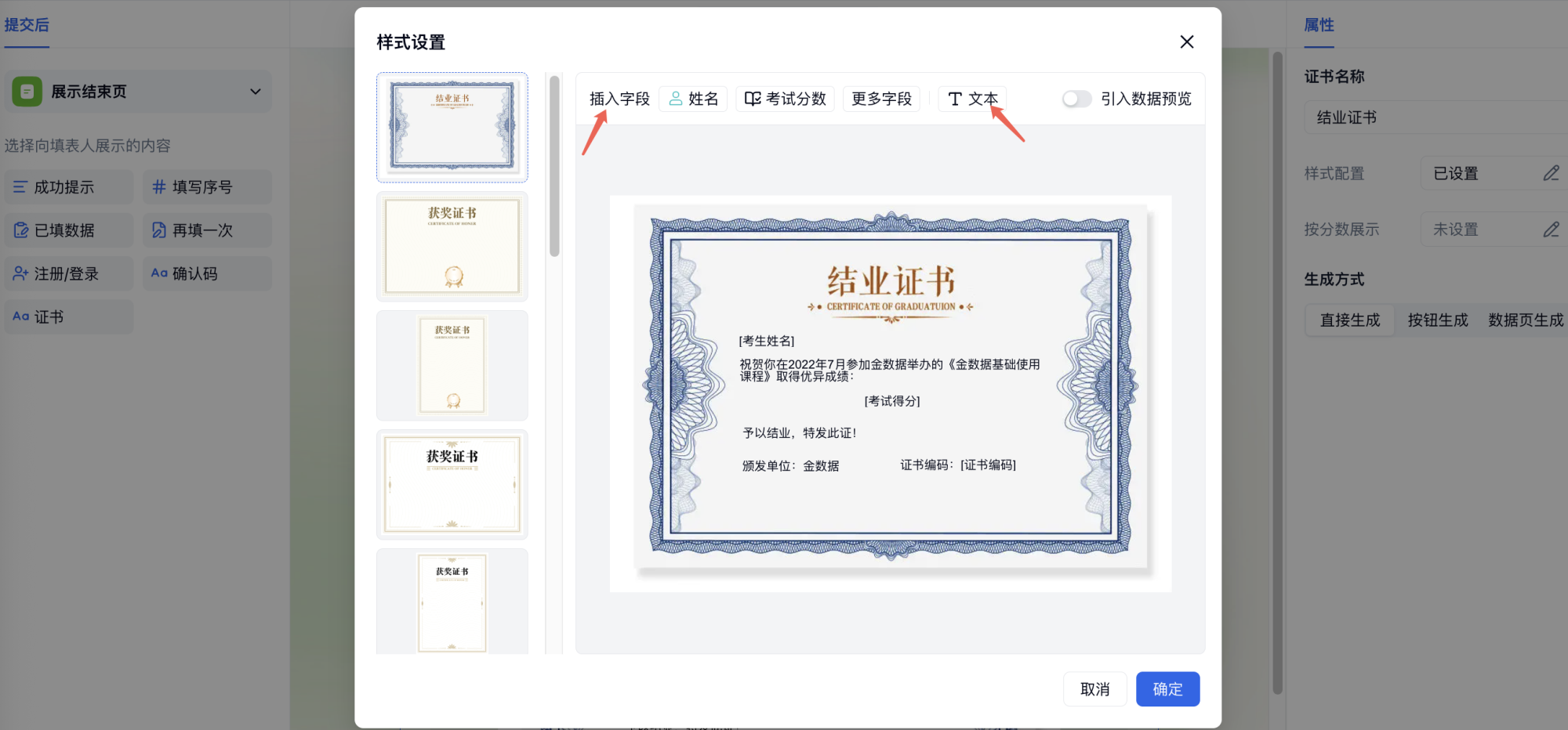 点击「插入字段」可以选择插入已设置好的证书编码。点击插入的字段是可以拖送到合适的位置。