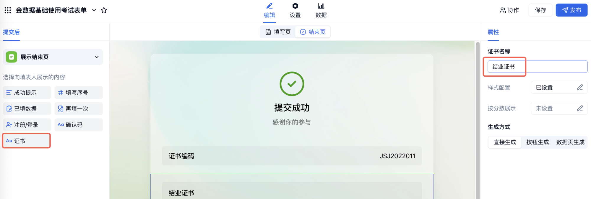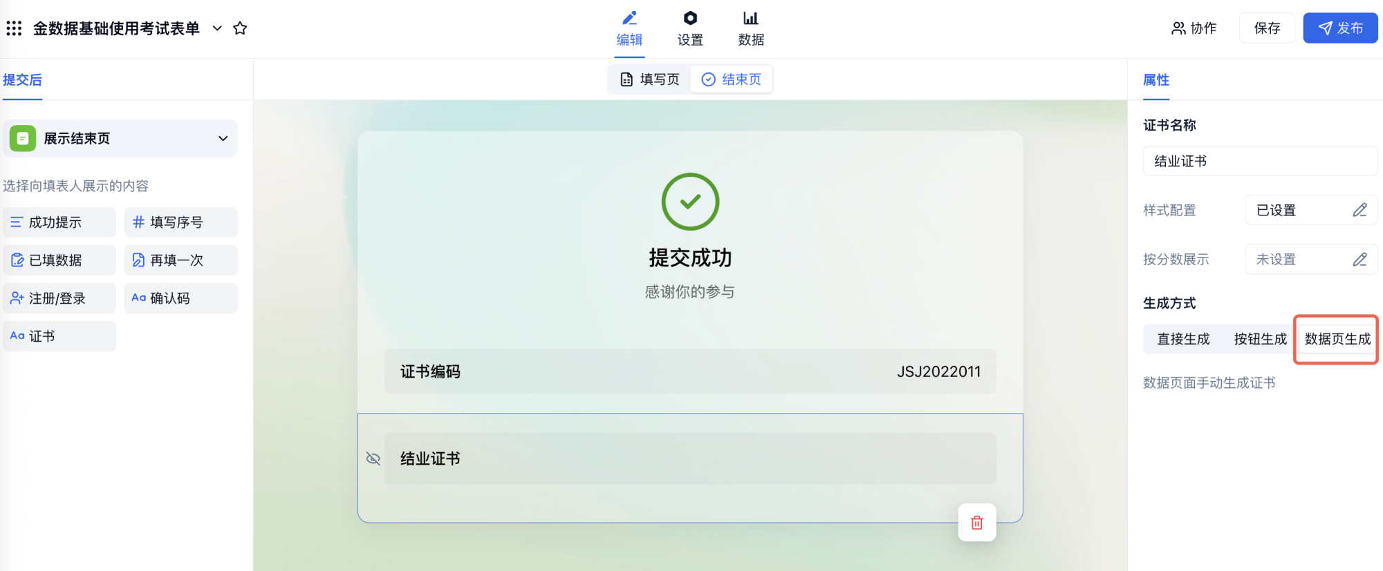 先到表单的「编辑」→「结束页」→「证书」→「生成方式」页面,设置为「数据页面生成」。