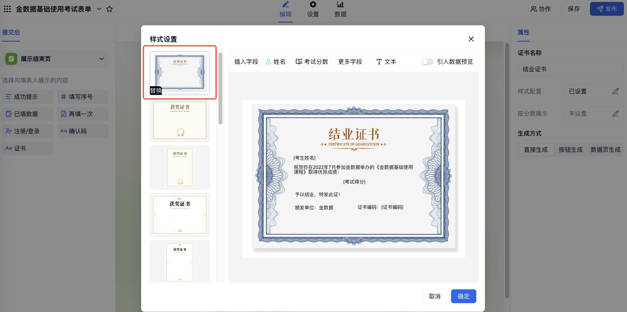 我们以考试表单为例,金数据开展第 202201 期基础使用培训后,发布结业考试表单,人员提交后可以获得含有证书编码的结业证书。设置步骤如下。