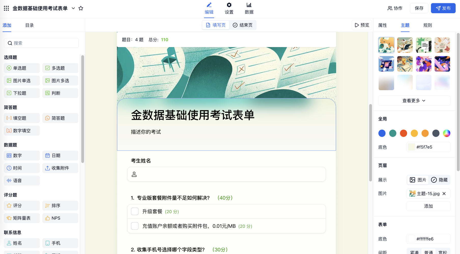 创建考试场景表单,表单中添加姓名、单选题等字段。