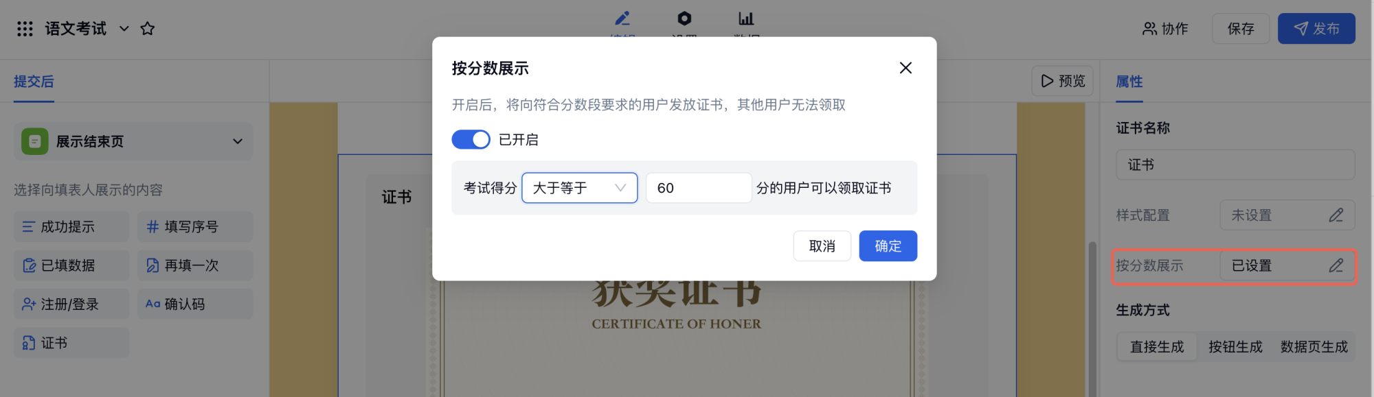 展示方式有「点击按钮展示证书」「提交后直接展示证书」「数据页面手动生成」3 种。其中「考试类」表单,支持设置「按分数展示」,可向符合分数段要求的用户发放证书,其他用户无法领取。