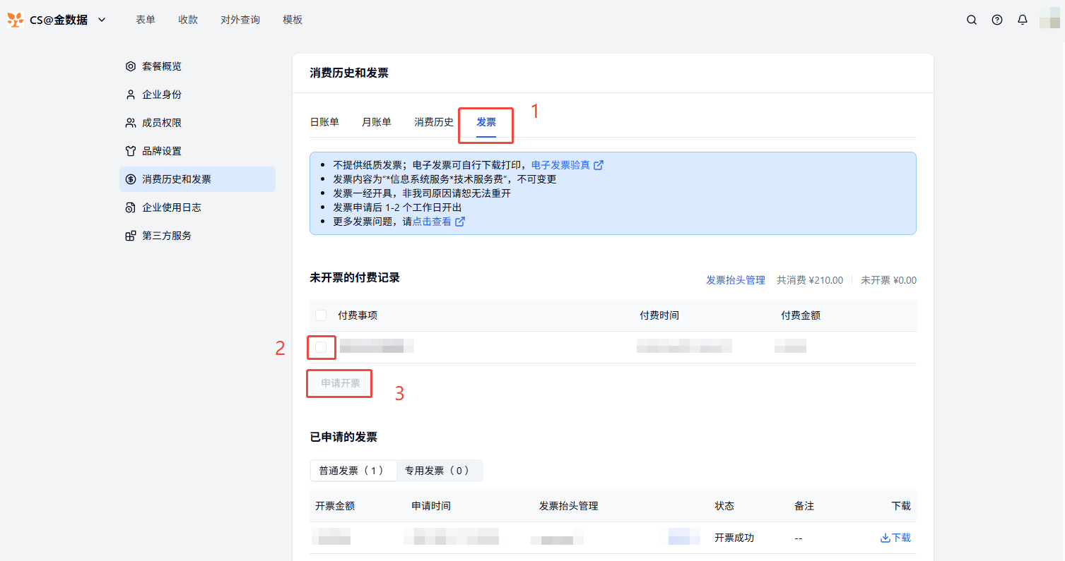 登录网页版金数据后,点击右上角的「系统设置」→「消费历史与发票」→「发票」,勾选需要开票的金额,再点击「申请开票」。