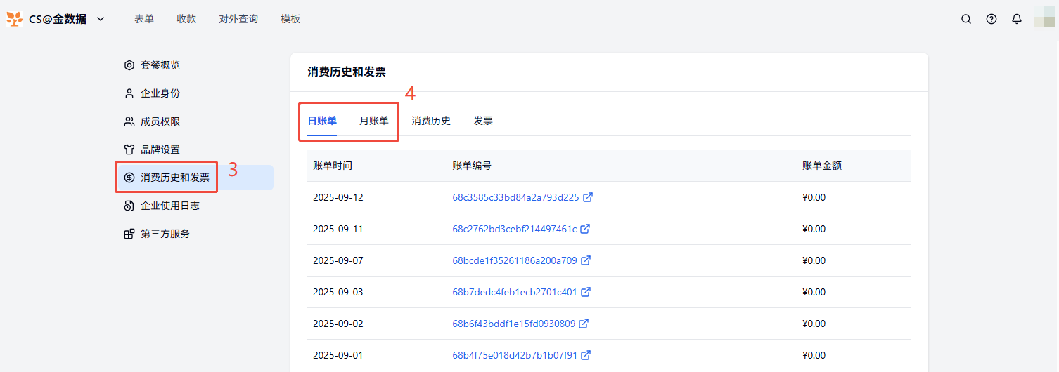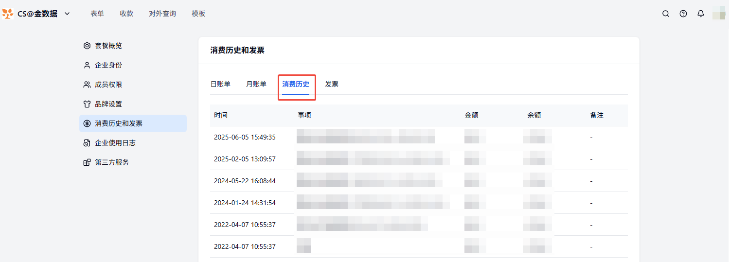 到「系统设置」→「消费历史和发票」,我们提供按日和按月查看的账单,点击蓝色的账单编号查看详情,包含短信、邮件、数据、附件上传等消费项目。