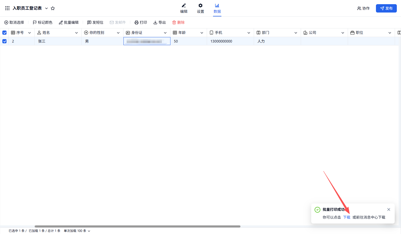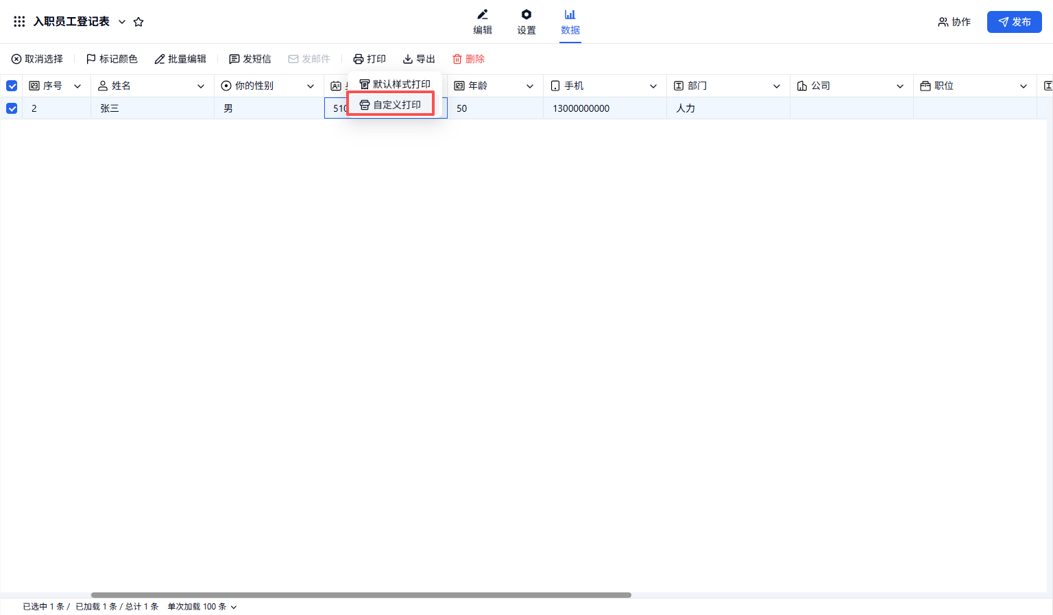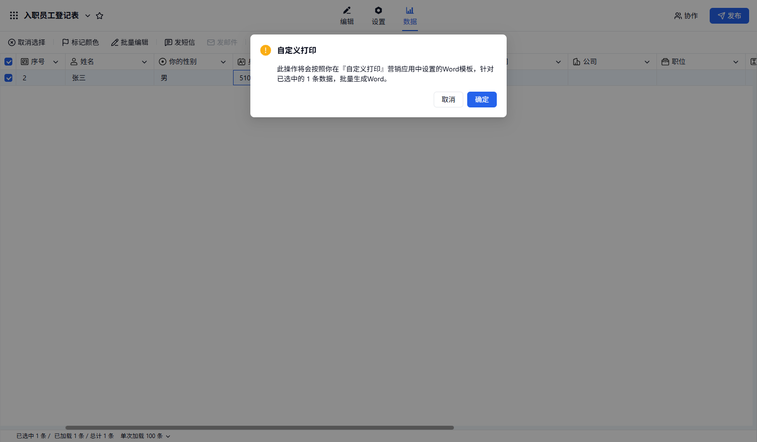 示例背景:HR 制作了一个入职人员登记表的表单,让应聘人员填写自己的个人信息然后参加面试。面试通过后需要将入职人员人员的信息打印到特定样式的 Word 中,以做存档。如果手动一条数据一条数据复制粘贴,工作效能较低,使用自定义打印功能可以一键打印到 Word 中。操作步骤如下所示。