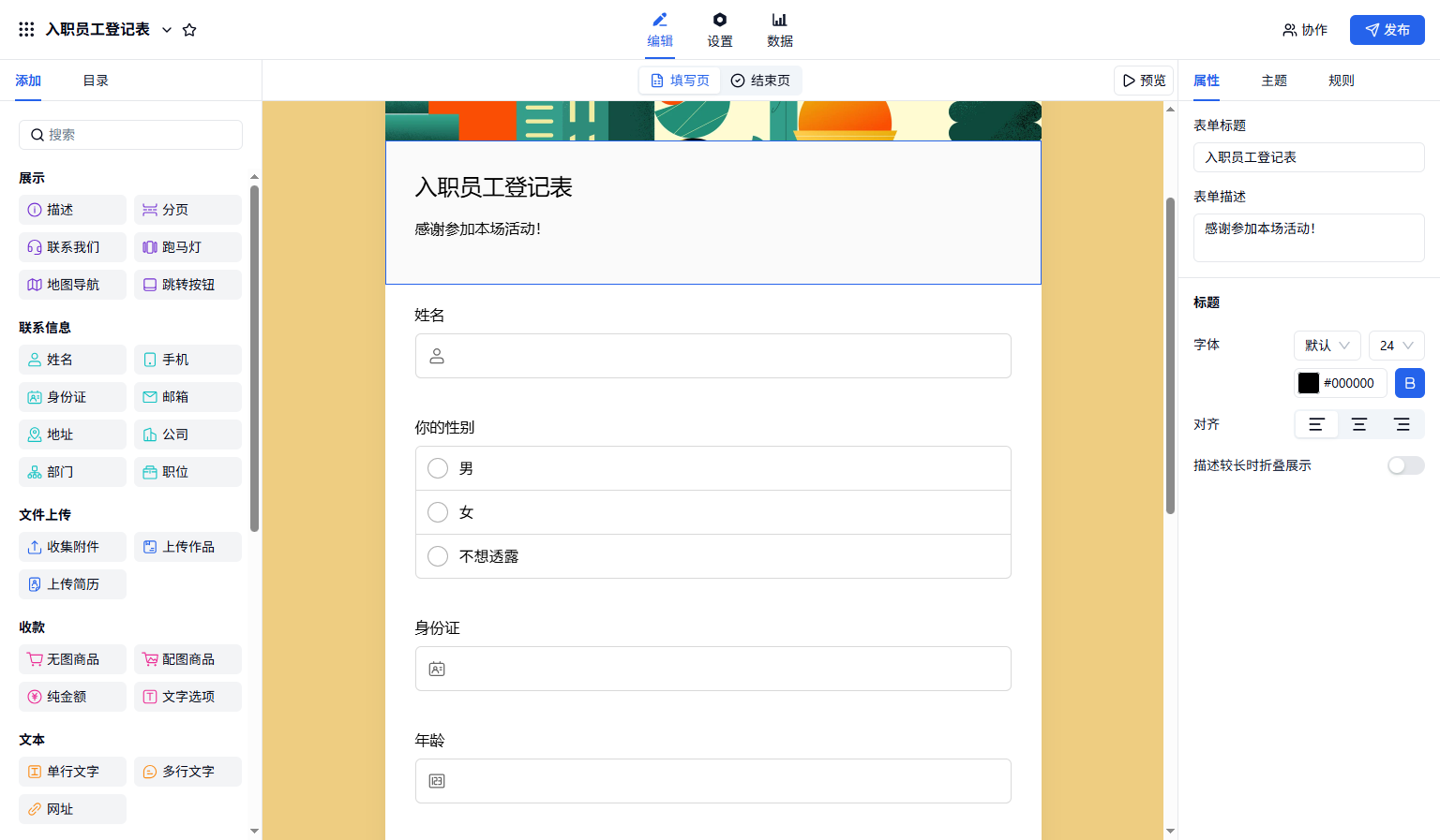 3.创建一个「入职人员登记表的表单」。该表单有姓名、性别等等。