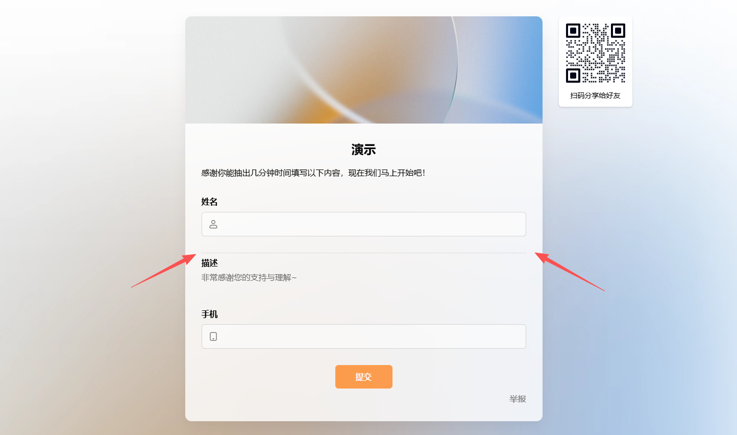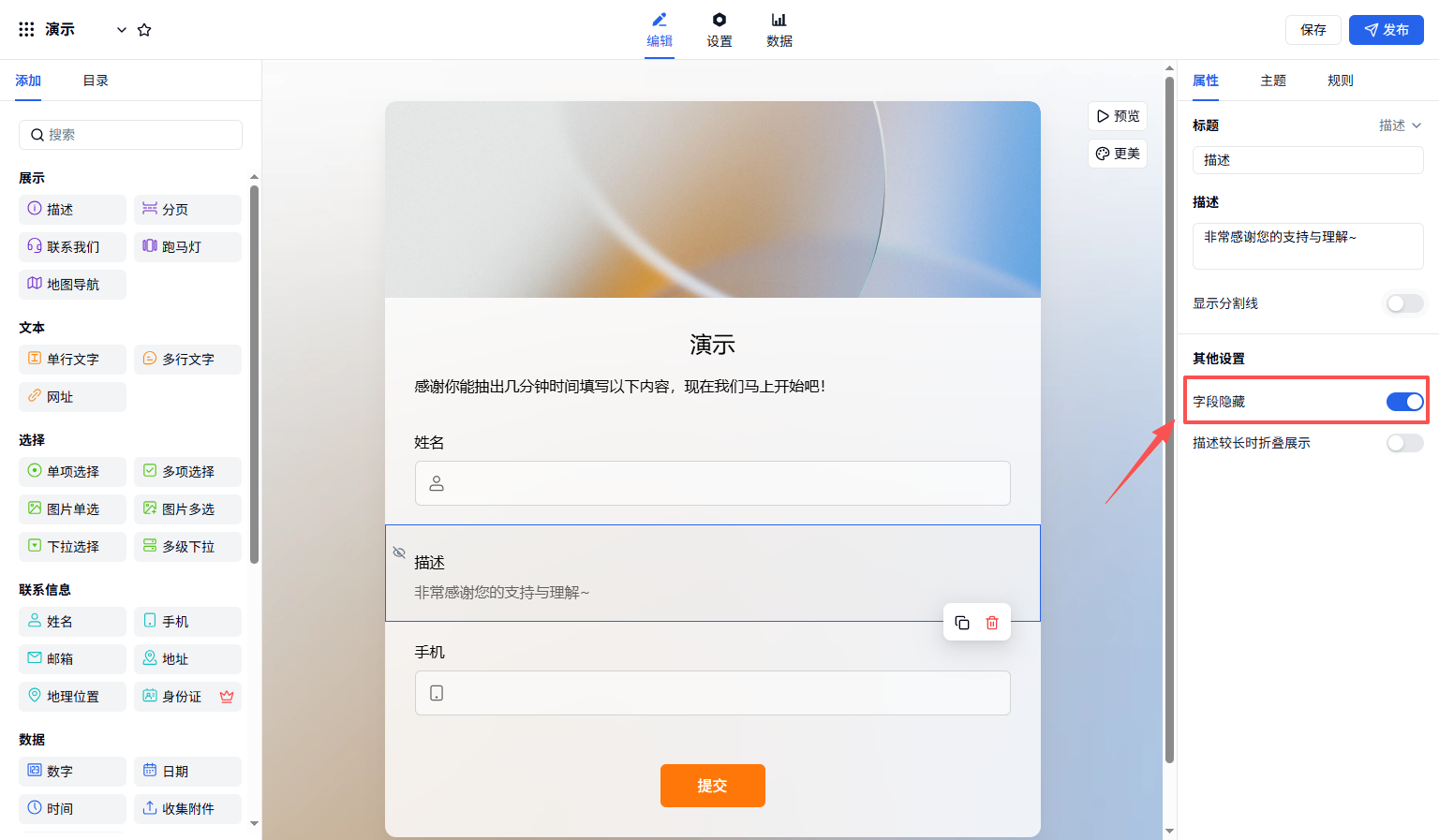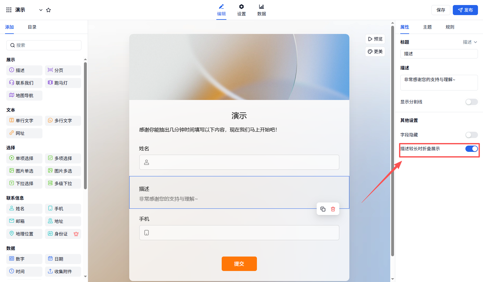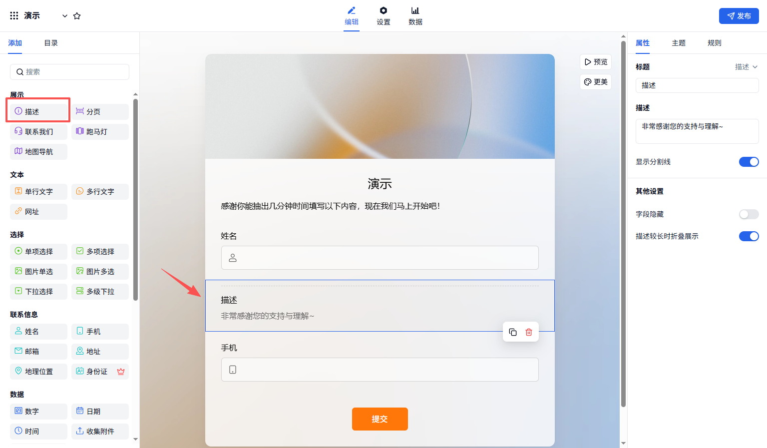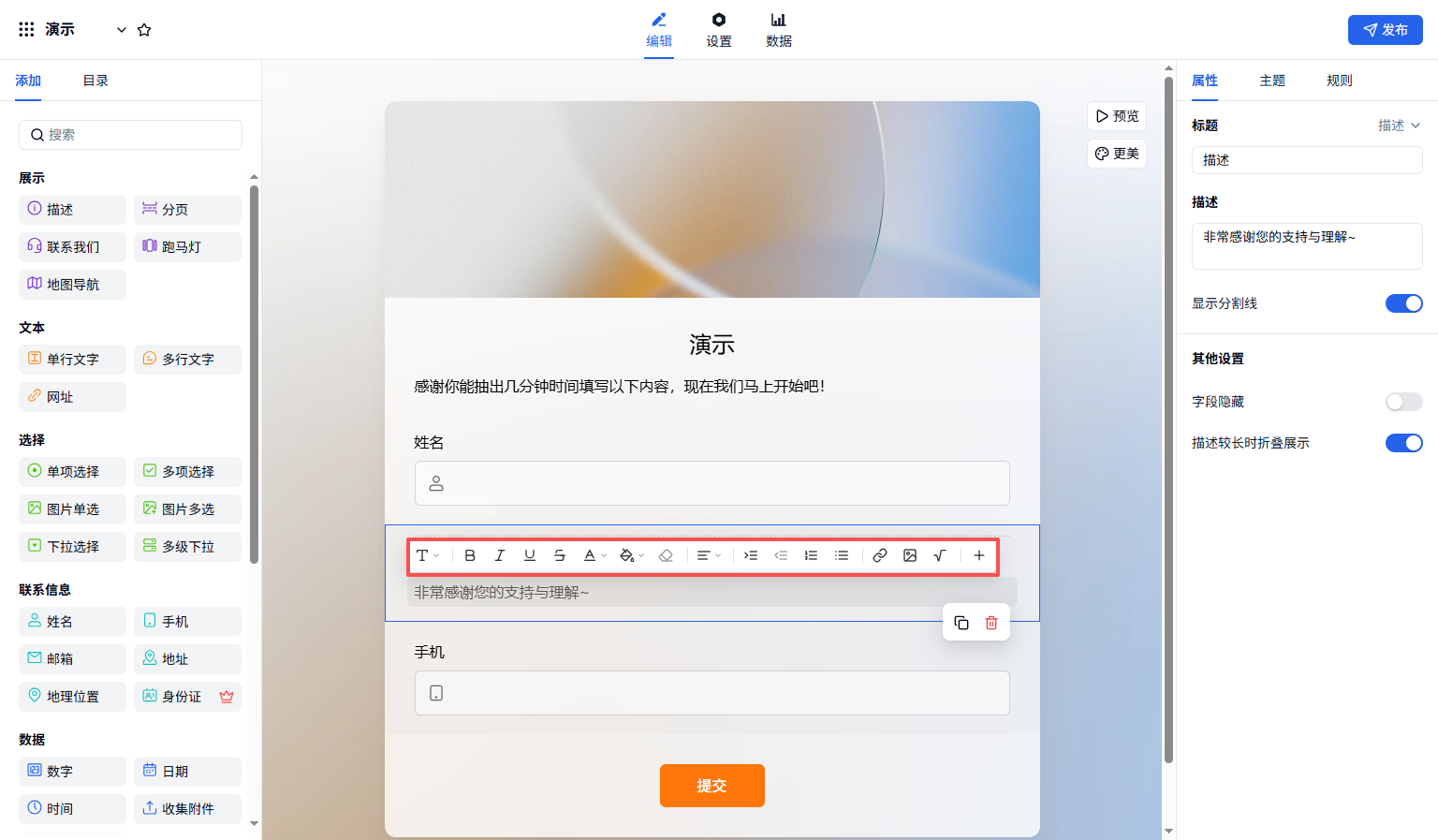 首页 / 帮助文档 / 表单制作与美化 描述字段介绍 描述字段用于展示文字、图片、超链接、视频等内容,无需填表人填写。 插入图片、超链接支持 gif、jpg、jpeg、png 格式,单张图片 ≤ 5MB。上传的图片不会耗费套餐中的附件上传量。描述内容较长时折叠展示高度超过 300px 时自动折叠。除了描述字段,表单标题下的描述框也可以设置折叠显示,点击查看。显示分割线勾选后字段上方显示虚线分隔上下文。字段隐藏勾选后对填表人不可见。 发布日期:2025年09月12日 有帮助? 是 否