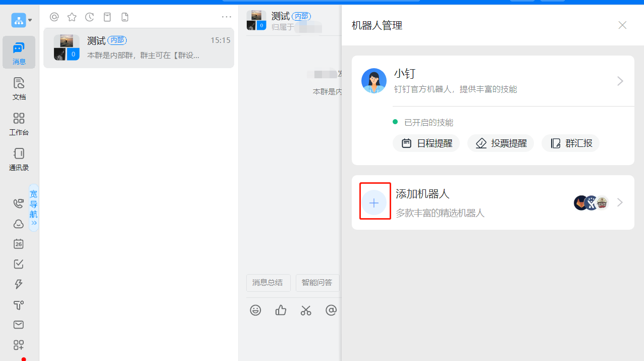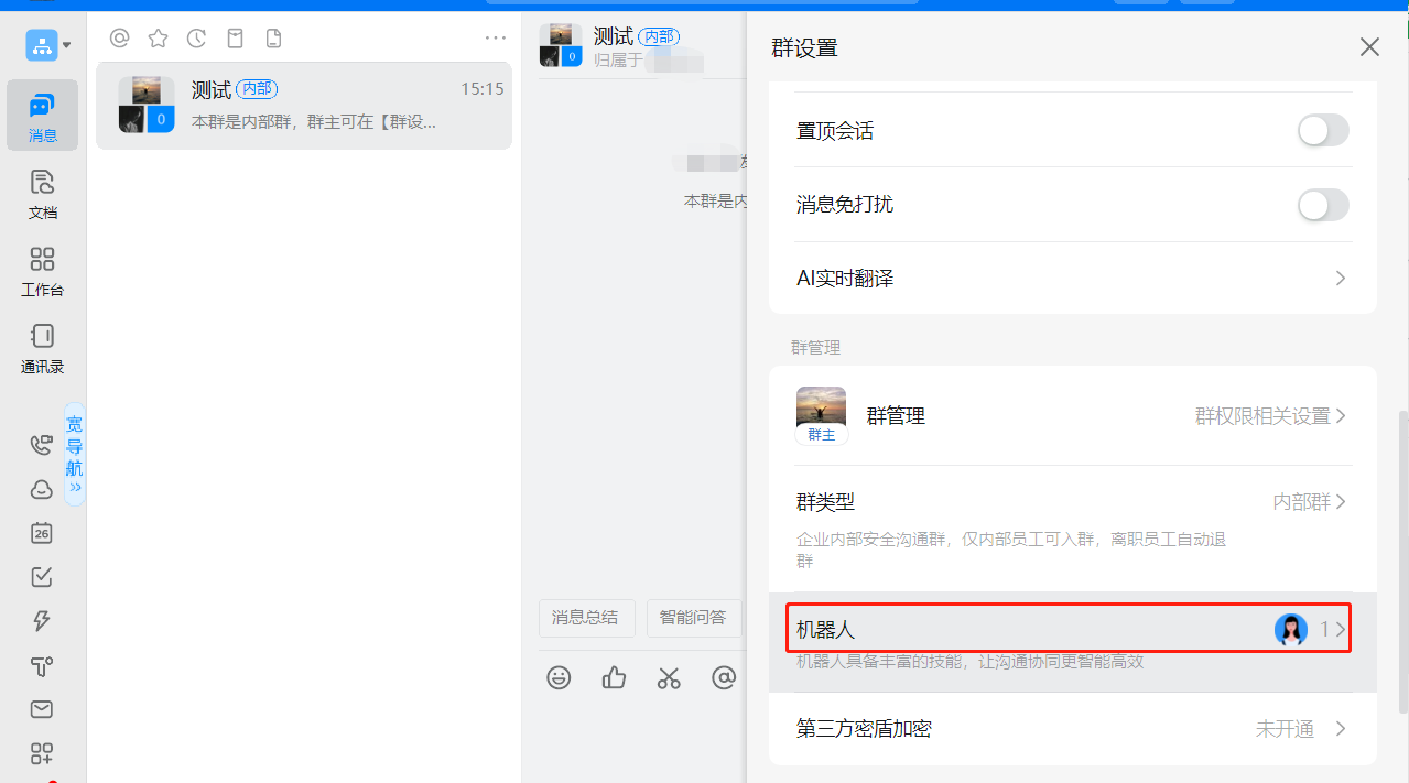 依次点击「群设置」→「机器人」→「添加机器人」;