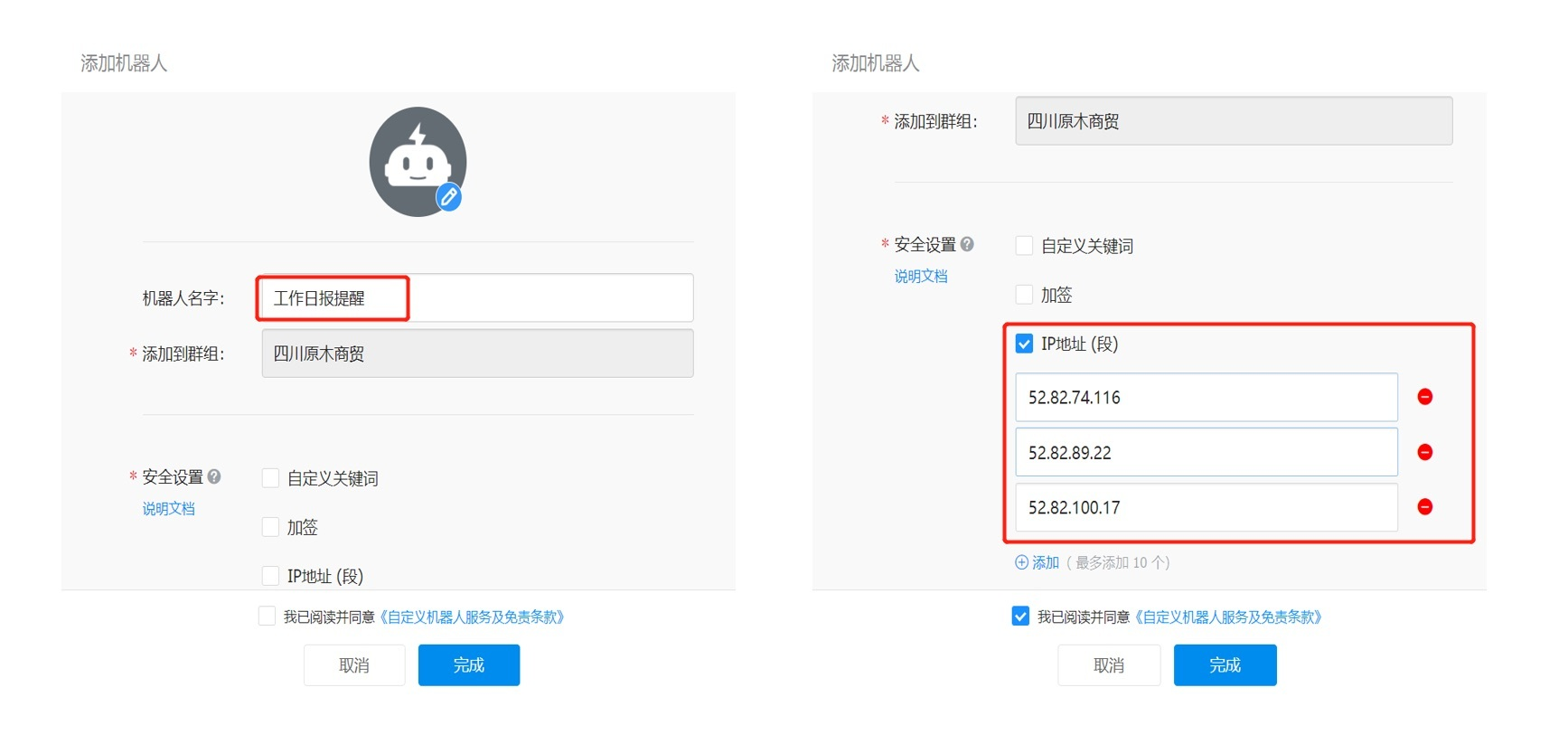 选择要发送消息的群,并勾选我已阅读并同意《自定义机器人服务及免责条款》;