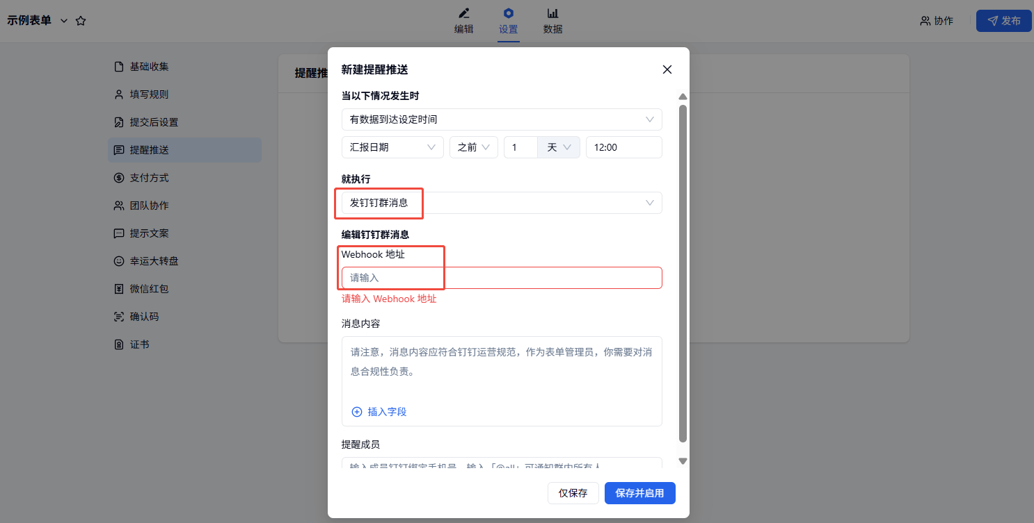 将钉钉群机器人的 Webhook 地址添加到「 Webhook 地址」中,编辑要发送的内容、设置钉钉中需要提醒成员的手机号;