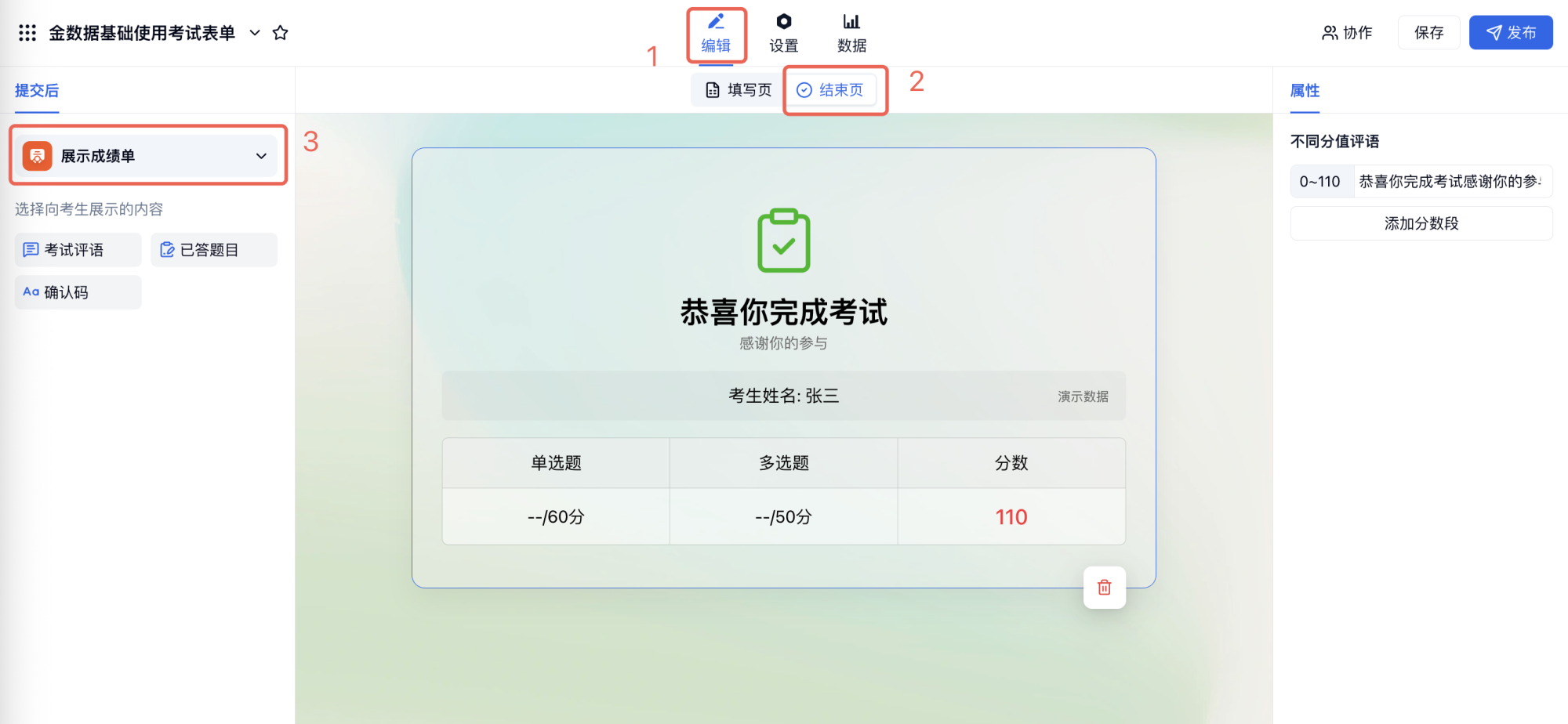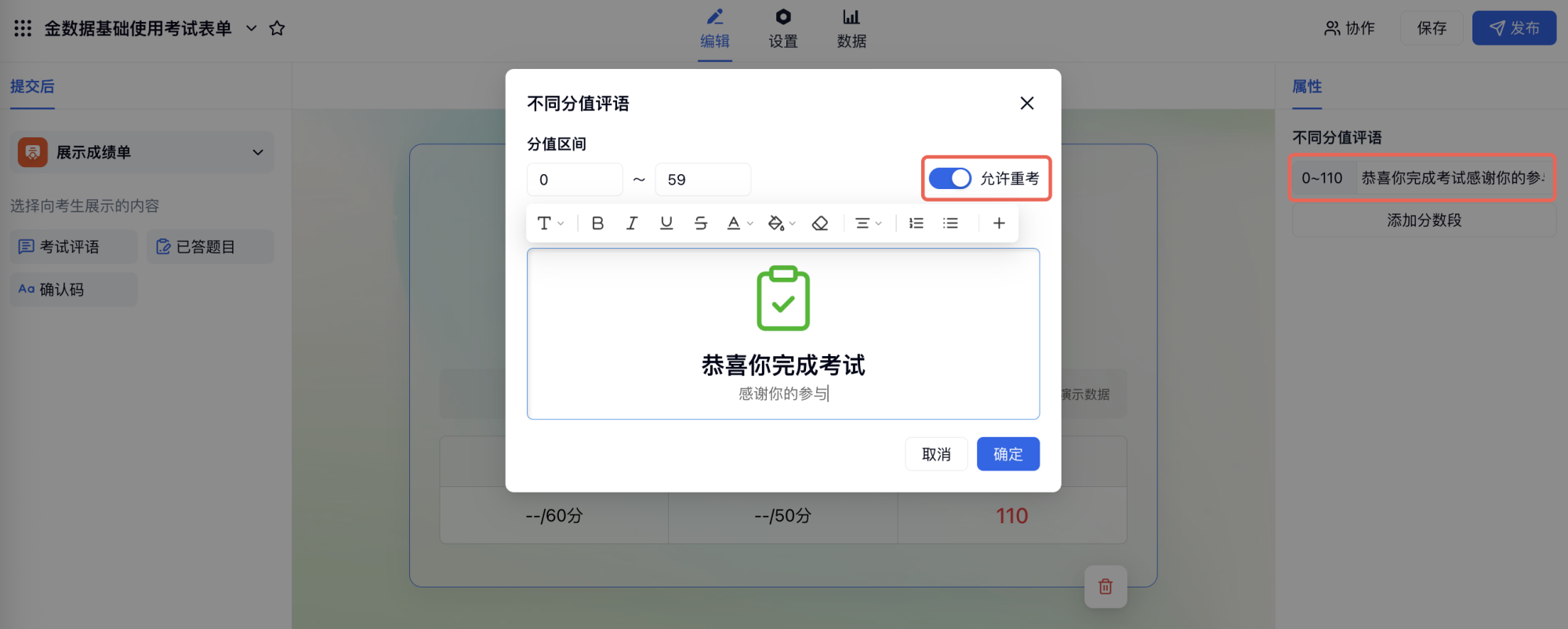 在「编辑」 → 「结束页」 → 左侧选择「展示成绩单」→「考试评语」,右侧可设置不同分数段显示不同评语,评语内容支持自定义。还支持得分在某一分数段的考生「允许重考」。