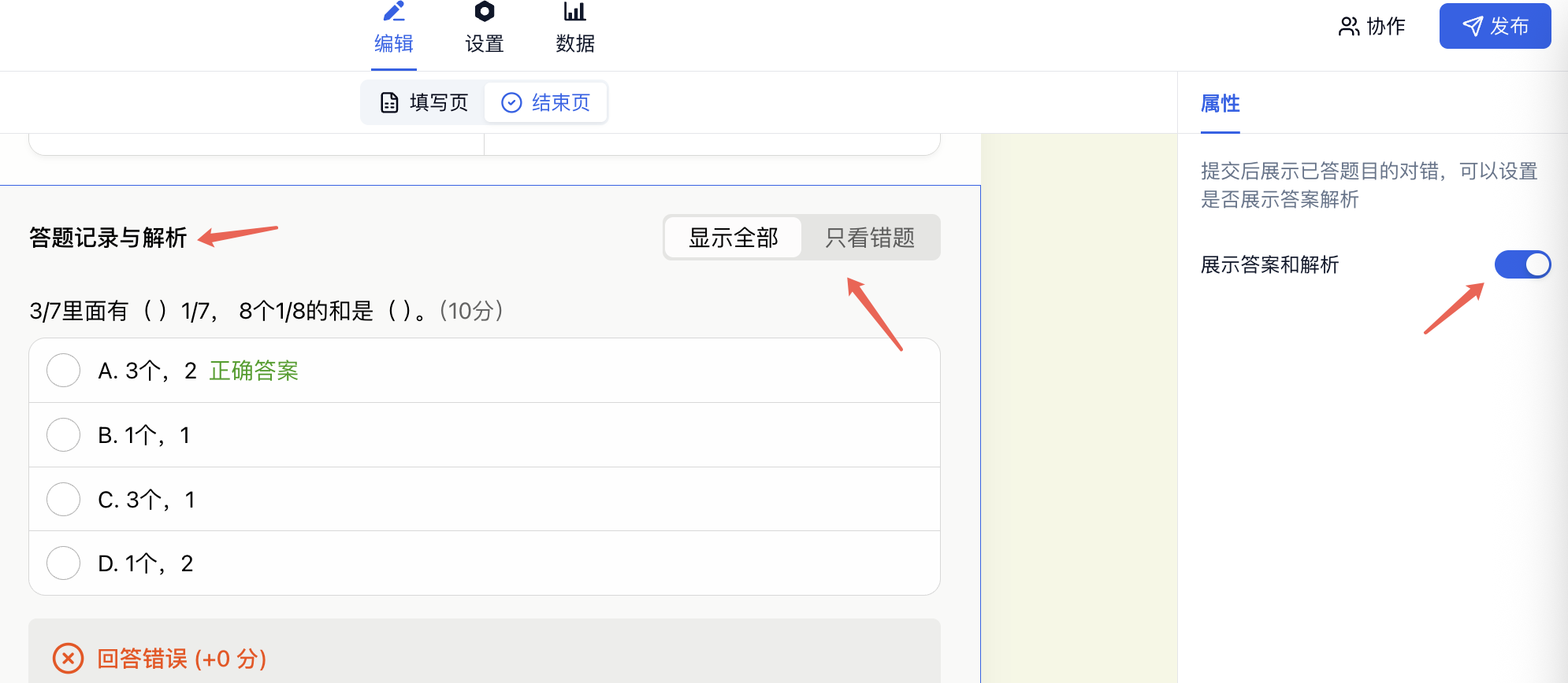 继续选中中间「答题记录与解析」→开启「展示答案和解析」,可查看全部题目或「只看错题」的答案和解析。多选题、图片多选设置评分类型为「为每个选项设置分数」,则不会出现在错题列表。