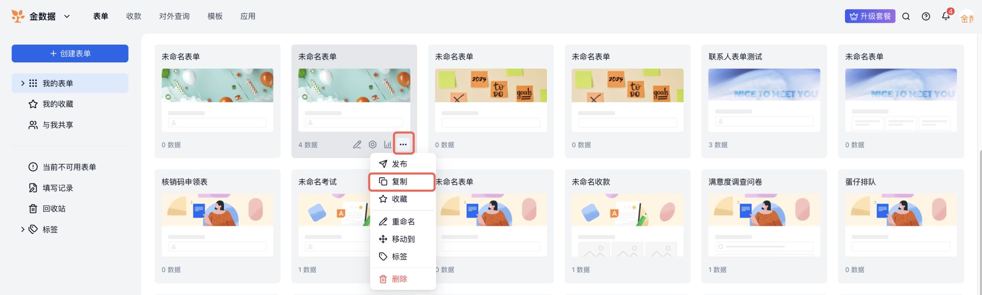 可在「我的表单」页面,点击表单卡片右下角「...」按钮,复制表单。
