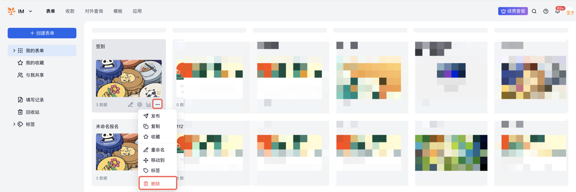 可在「我的表单」页面,点击表单卡片右下角「...」按钮,删除表单。若表单被误删,可在回收站恢复表单。