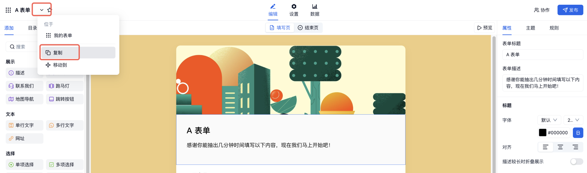 或进入表单编辑页面,在左上角标题旁点击「复制」。
