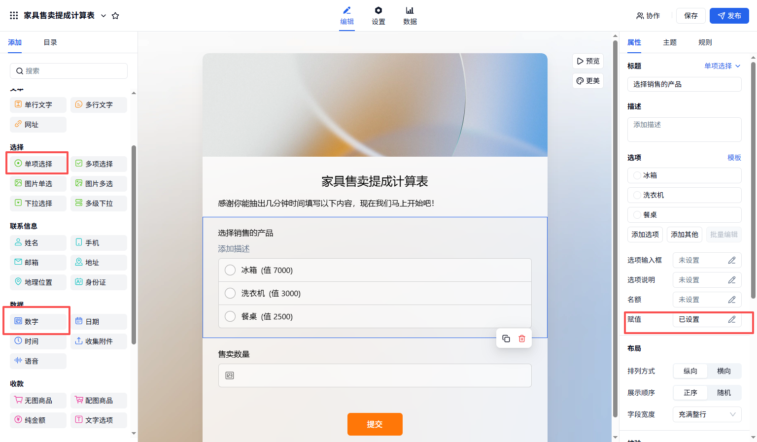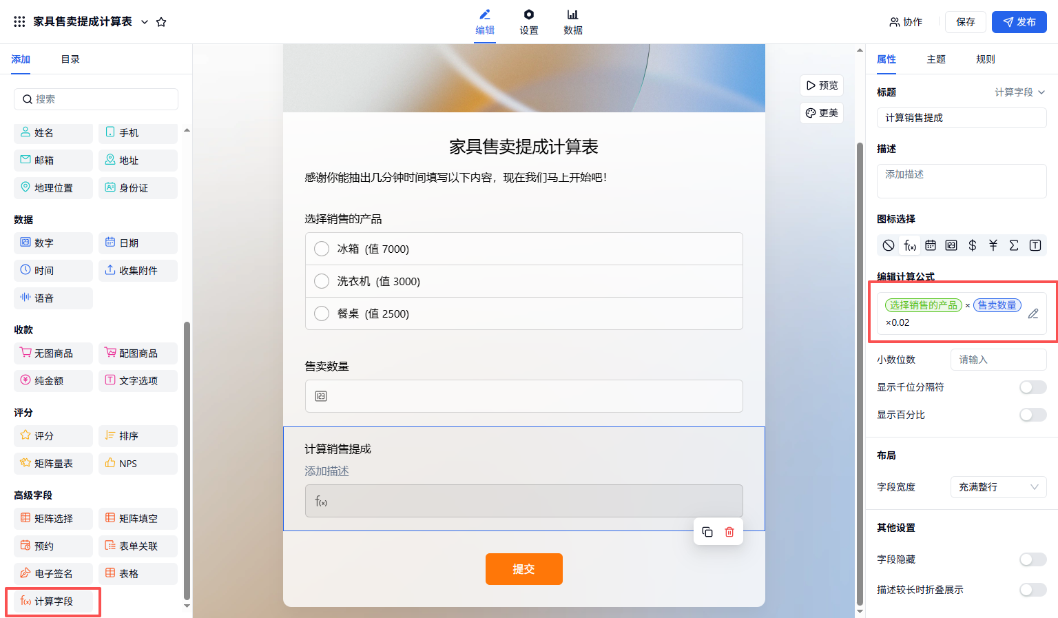 我们以售卖家具,计算销售提成为例,销售的产品 数量 提成点 = 提成业绩,详细设置步骤如下。