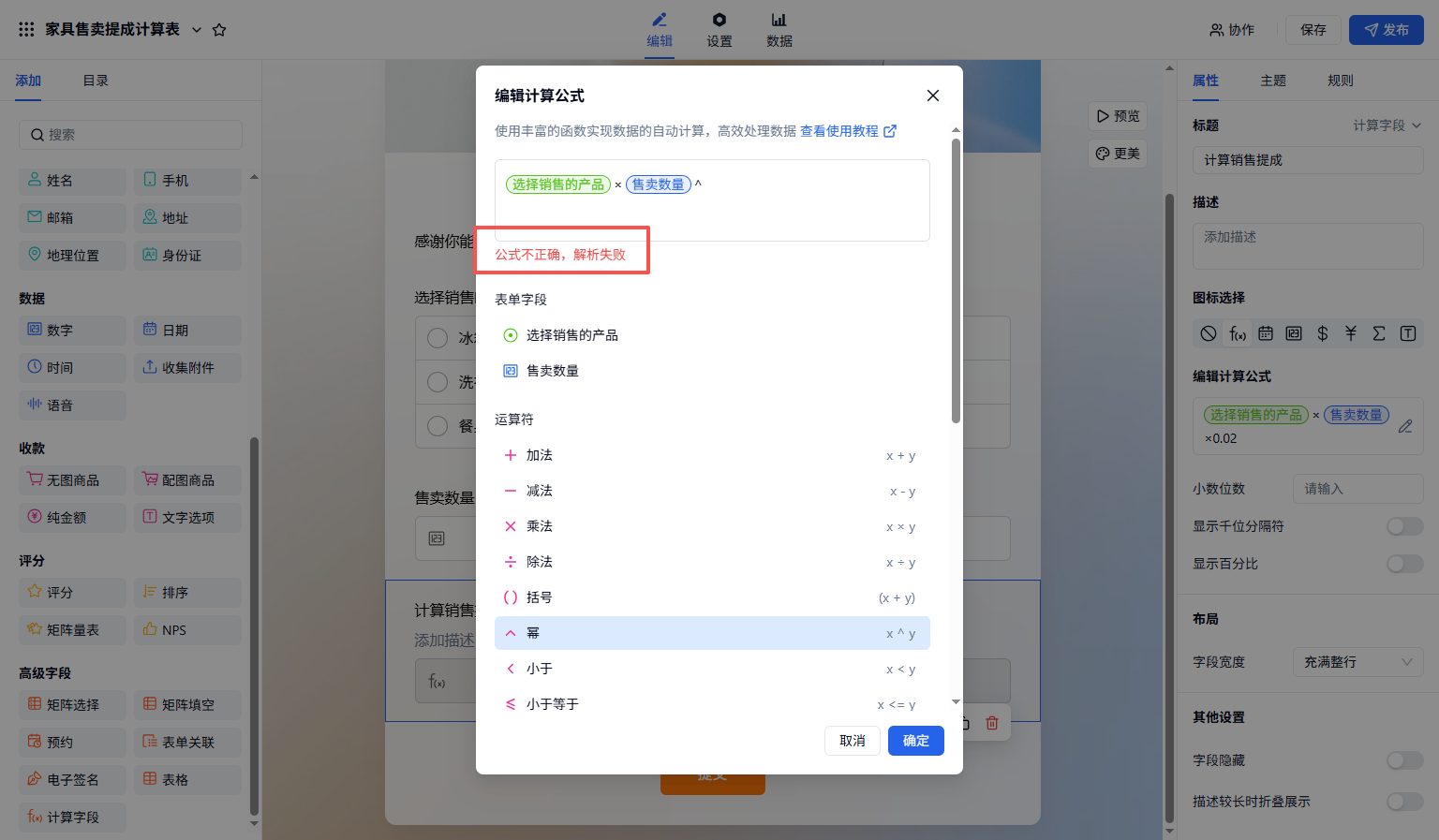 若公式不合法,系统将提示「公式不正确,解析失败」,请重新设置计算公式再点击确定。