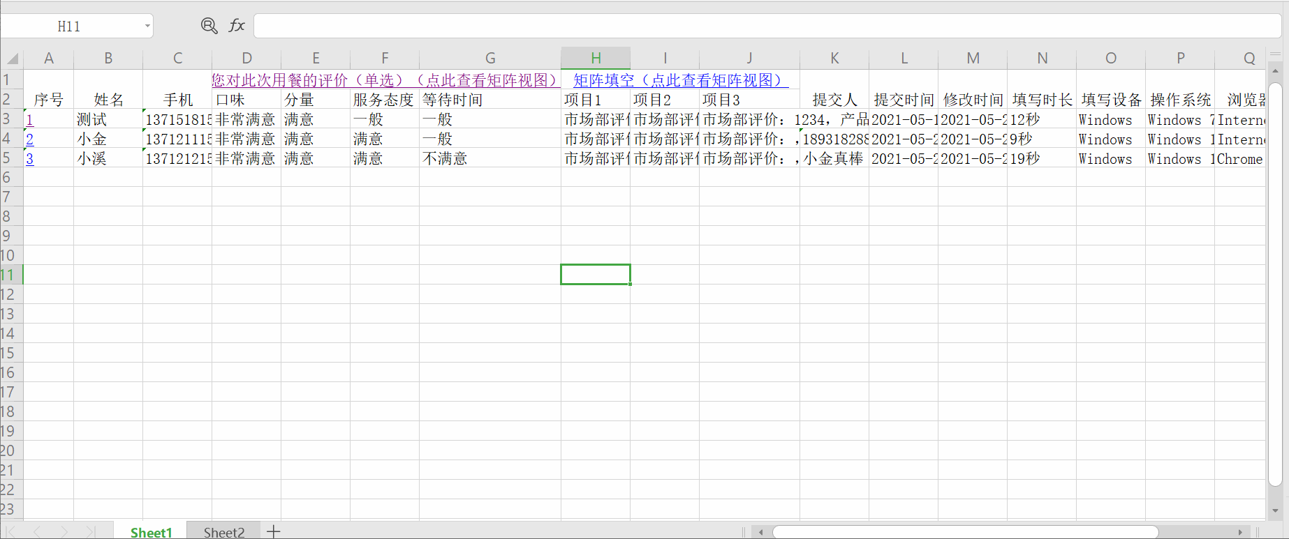 包含「矩阵选择」和「矩阵填空」字段的数据导出 Excel 后,你将在 Excel 中看到两张表格,第一张仍是之前的样式,第二张专门存放所有矩阵字段。你可以通过序号和矩阵字段的标题跳转于两个表格。