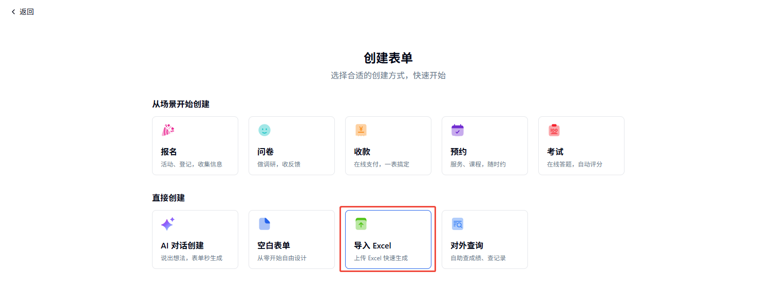 如果表单还未创建,可点击主页左上角「创建表单」,直接通过 Excel 创建表单的方式将数据导入到表单。