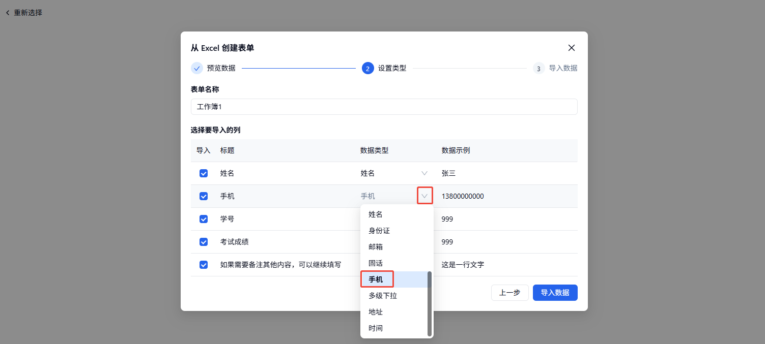 导入数据时,需要给每列数据选择适合的「数据类型」。