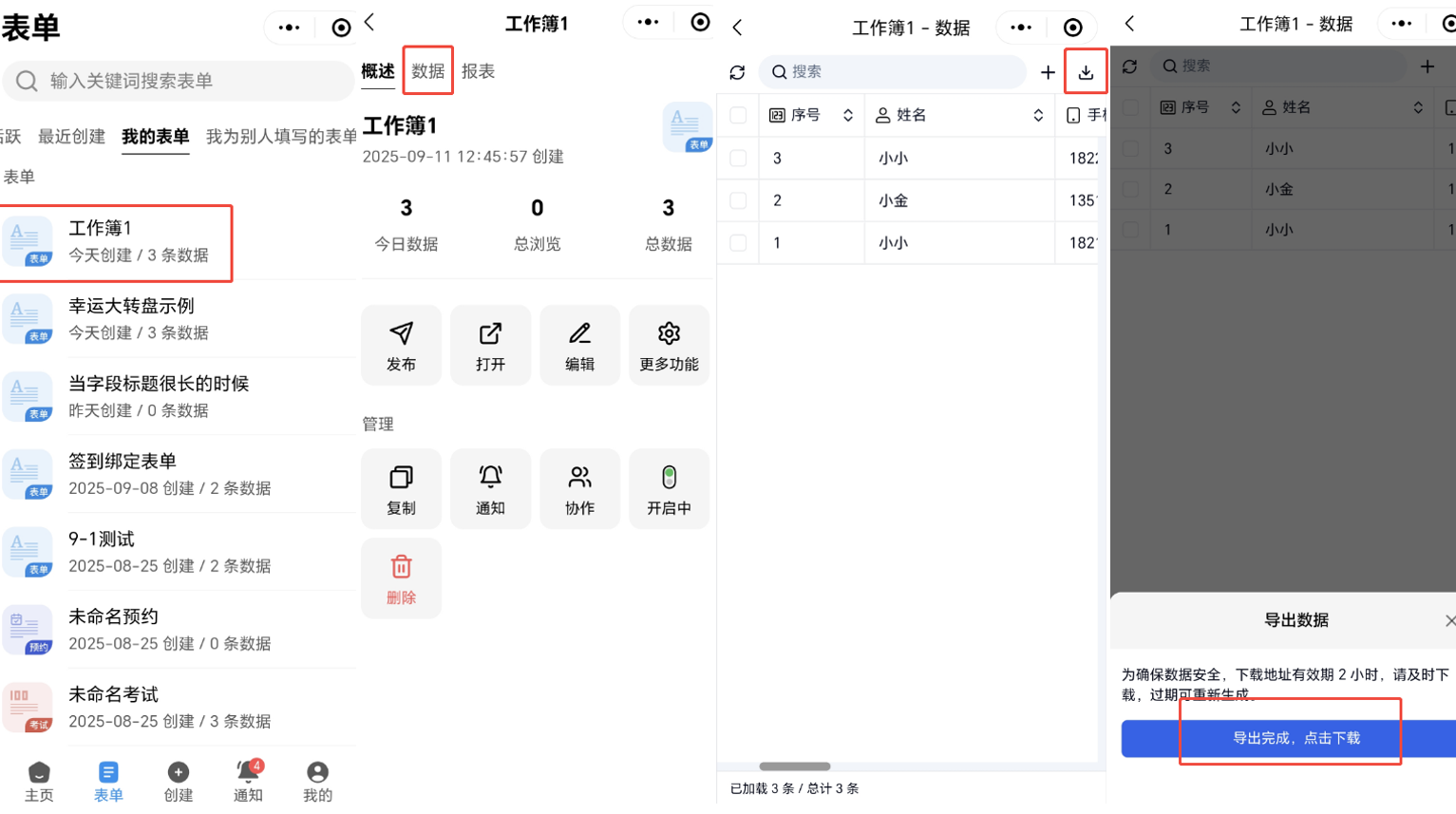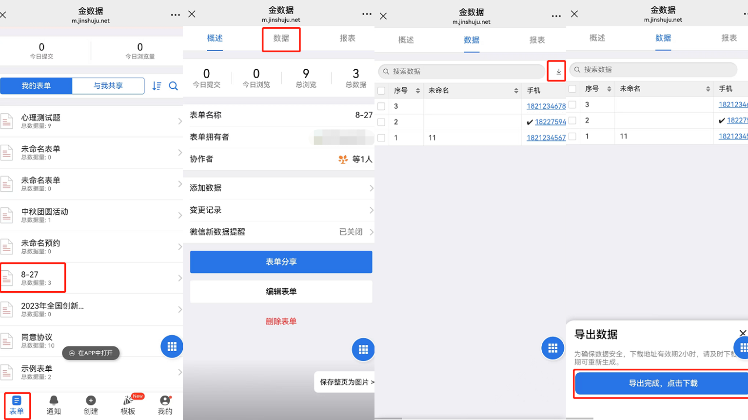 可在金数据小程序、APP、公众号或电脑端登录 jinshuju.net 进行数据导出。