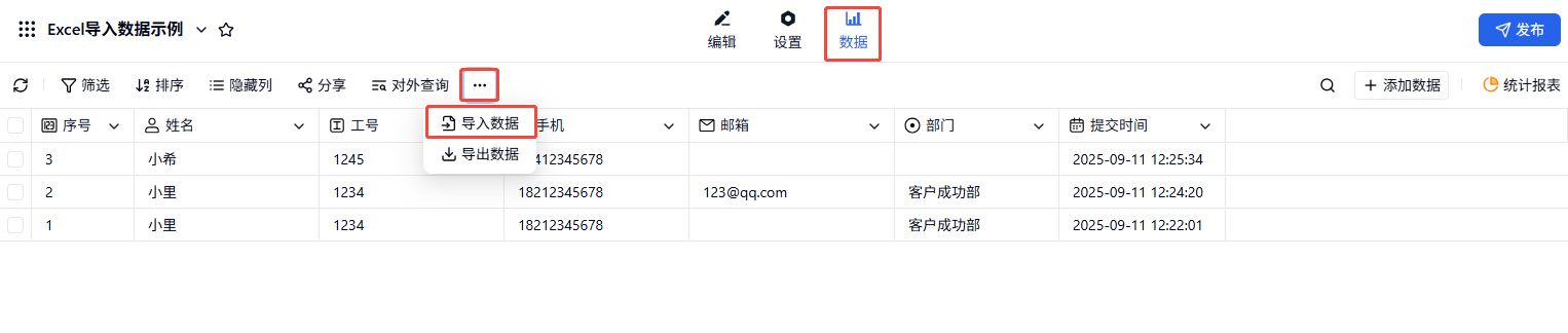 如果表单已创建完成,想将本地的 Excel 数据导入到表单,可进入表单数据页面,通过 Excel 批量导入数据。如果追加数据可以在表单「数据」的工具栏找到图标「···」→「导入数据」。