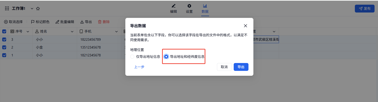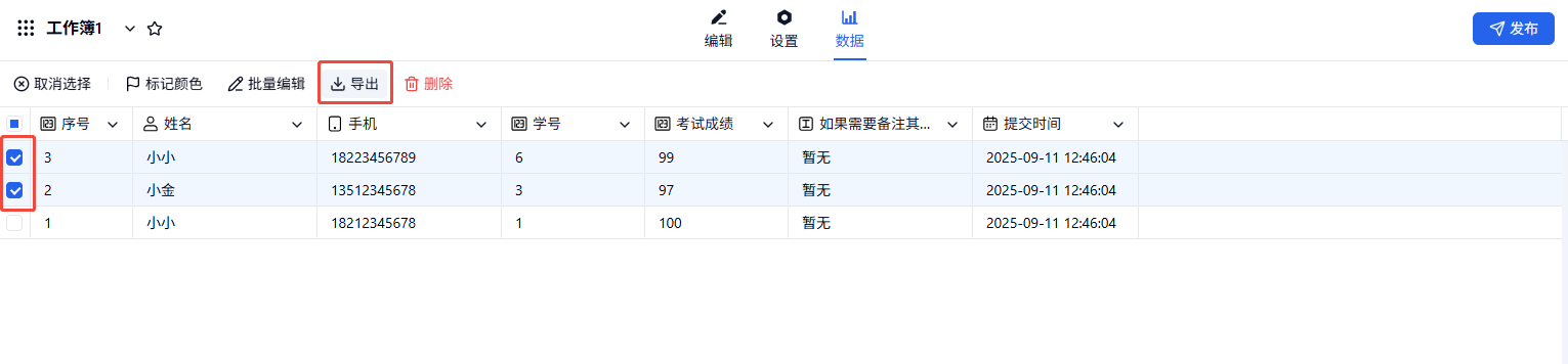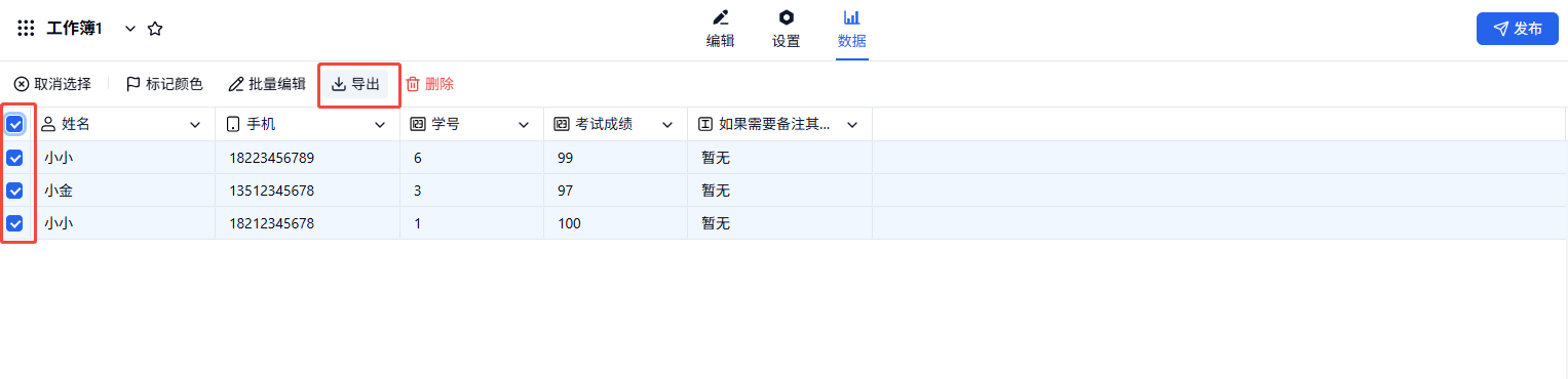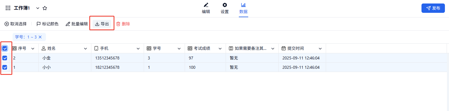 若要导出特定行的数据,请依次在需导出数据的序号前打勾,并点击「导出」。