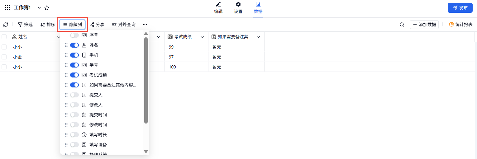 若需要导出指定列的数据,请先点击「隐藏列」,隐藏无需导出字段后,勾选全部数据,并点击「导出」。