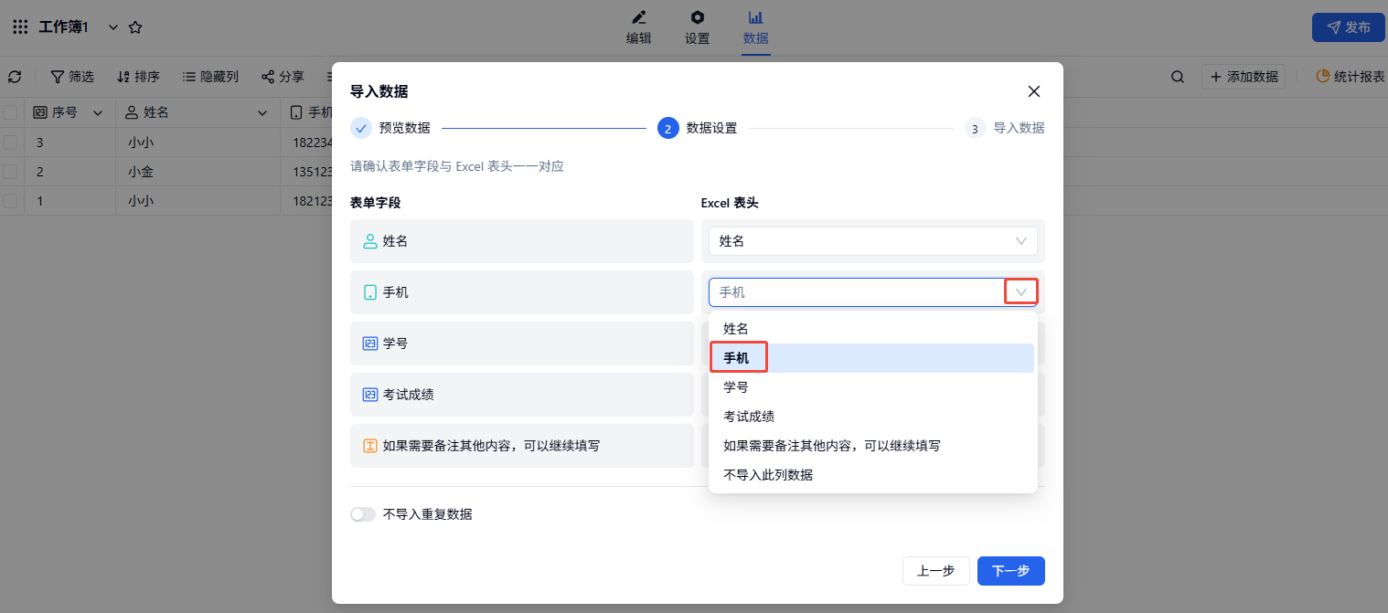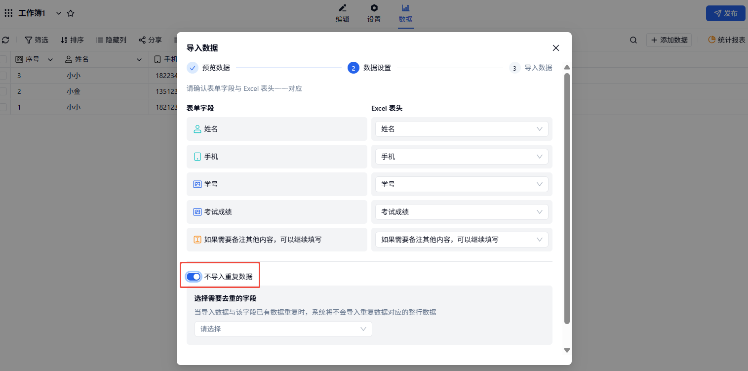 从 Excel 追加数据时勾选「不导入重复数据」即可去除重复数据。每次导入数据时只能选择一个字段进行去重,当导入数据与该字段已有数据重复时,系统将不会导入重复数据对应的整行数据。当表单数据超过 5 万条时,不支持导入重复数据功能。支持去重的字段类型:「单行文字」「姓名」「手机」「固话」「网址」和「邮箱」。