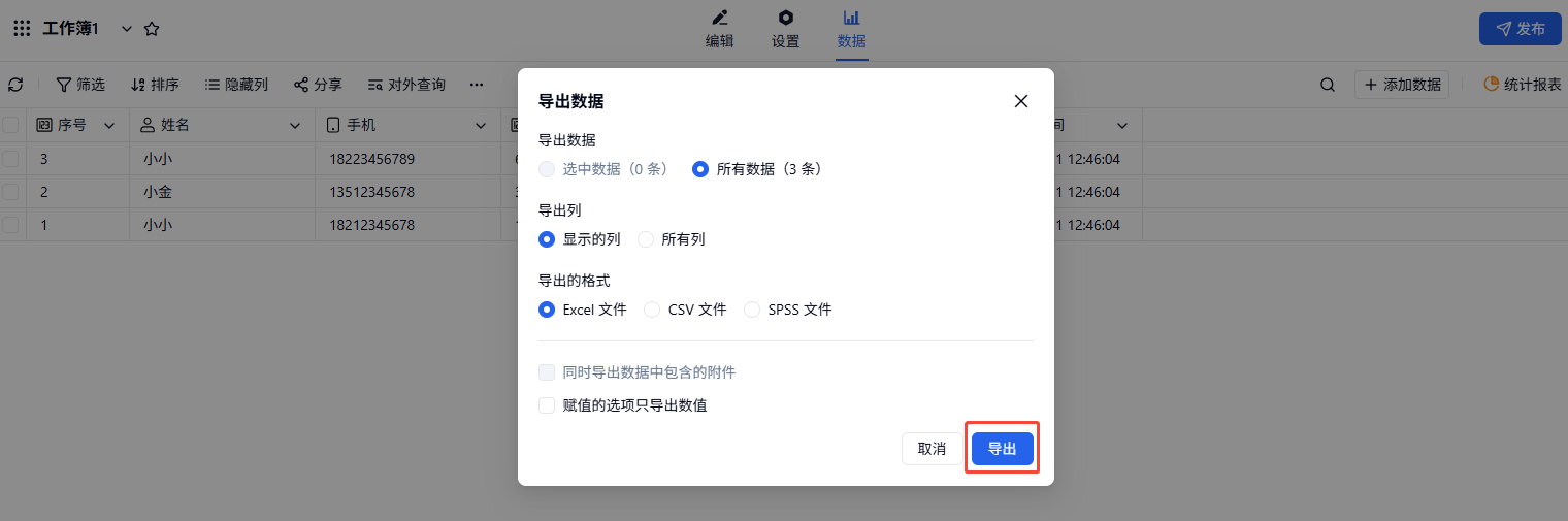 选择导出格式,例如 Excel 文件或 CSV 文件,并点击「导出」。