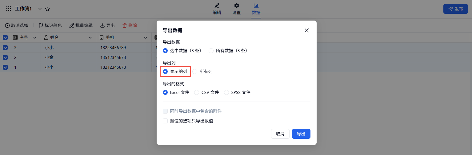 选择「选中的数据」→「显示的列」,确认导出格式,并点击「导出」。